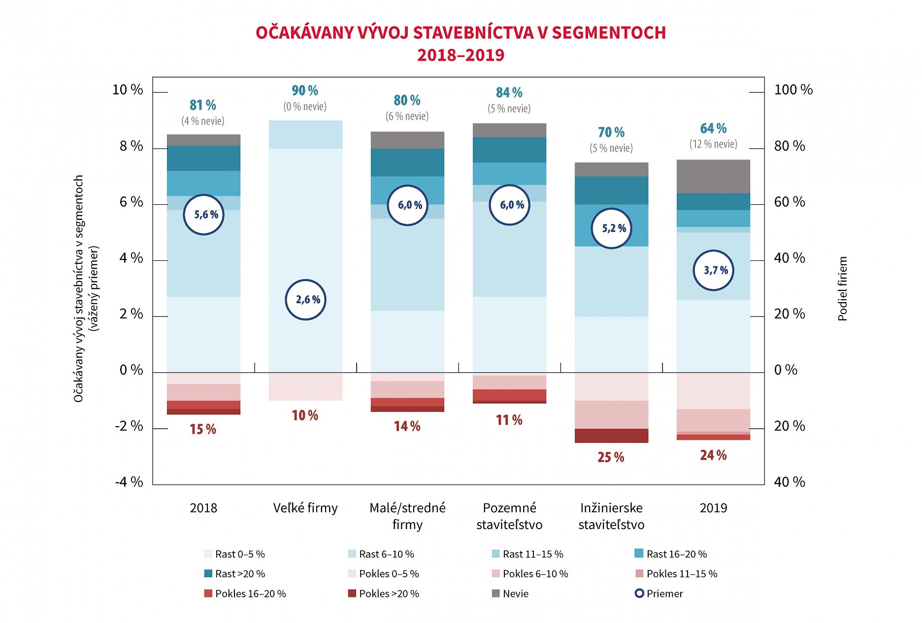 Stavebníctvo čaká pre rok 2018 rast o 5,6 percenta. Optimistickejší pohľad majú spoločnosti zameriavajúce sa na pozemné staviteľstvo (rast 6,0 percenta) oproti inžinierskemu staviteľstvu (5,2 percenta). Rozdielny pohľad nájdeme i pri porovnaní veľkosti spoločností. Väčší rast očakávajú malé a stredné spoločnosti (6,0 percenta), veľké spoločnosti predpokladajú nižšie navýšenie, a to o 2,6 percenta.