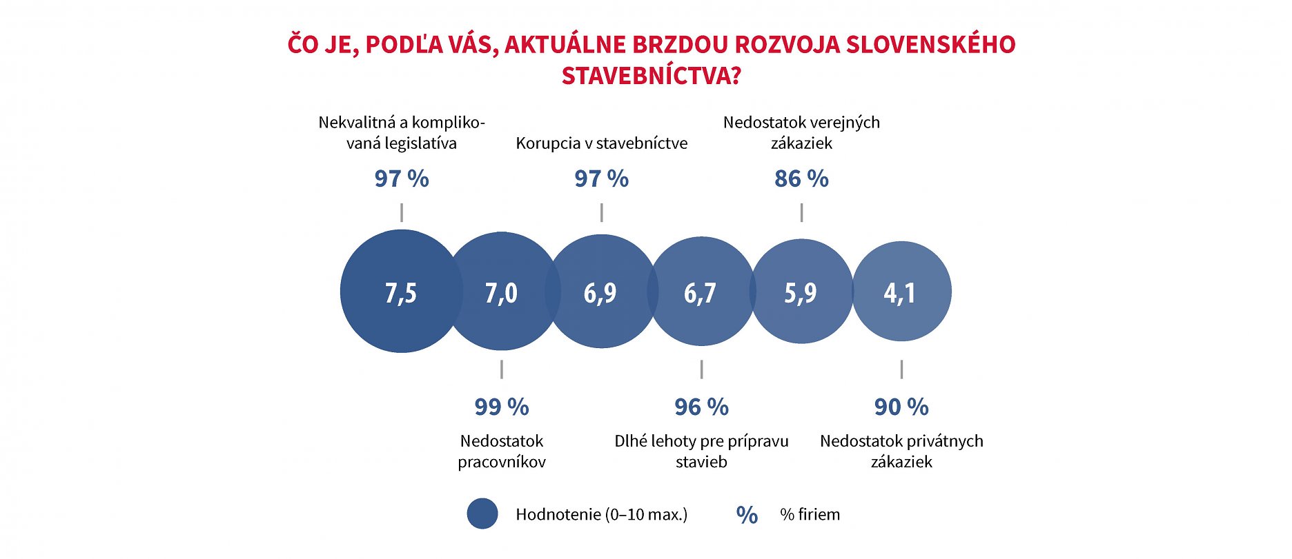 Stavebné spoločnosti v rozvoji najviac brzdí nekvalitná legislatíva a nedostatok pracovníkov. Tieto faktory ohodnotili riaditelia stavebných spoločností 7,5 bodmi, respektíve 7,0 bodmi z maximálnych 10, ktoré predstavujú najväčšiu brzdu. Zo stavebníctva odišlo veľké percento pracovníkov, ktorí sa, bohužiaľ, už nevrátili. Stavebné spoločnosti najmenej brzdí nedostatok privátnych zákaziek (4,1 bodov z 10).