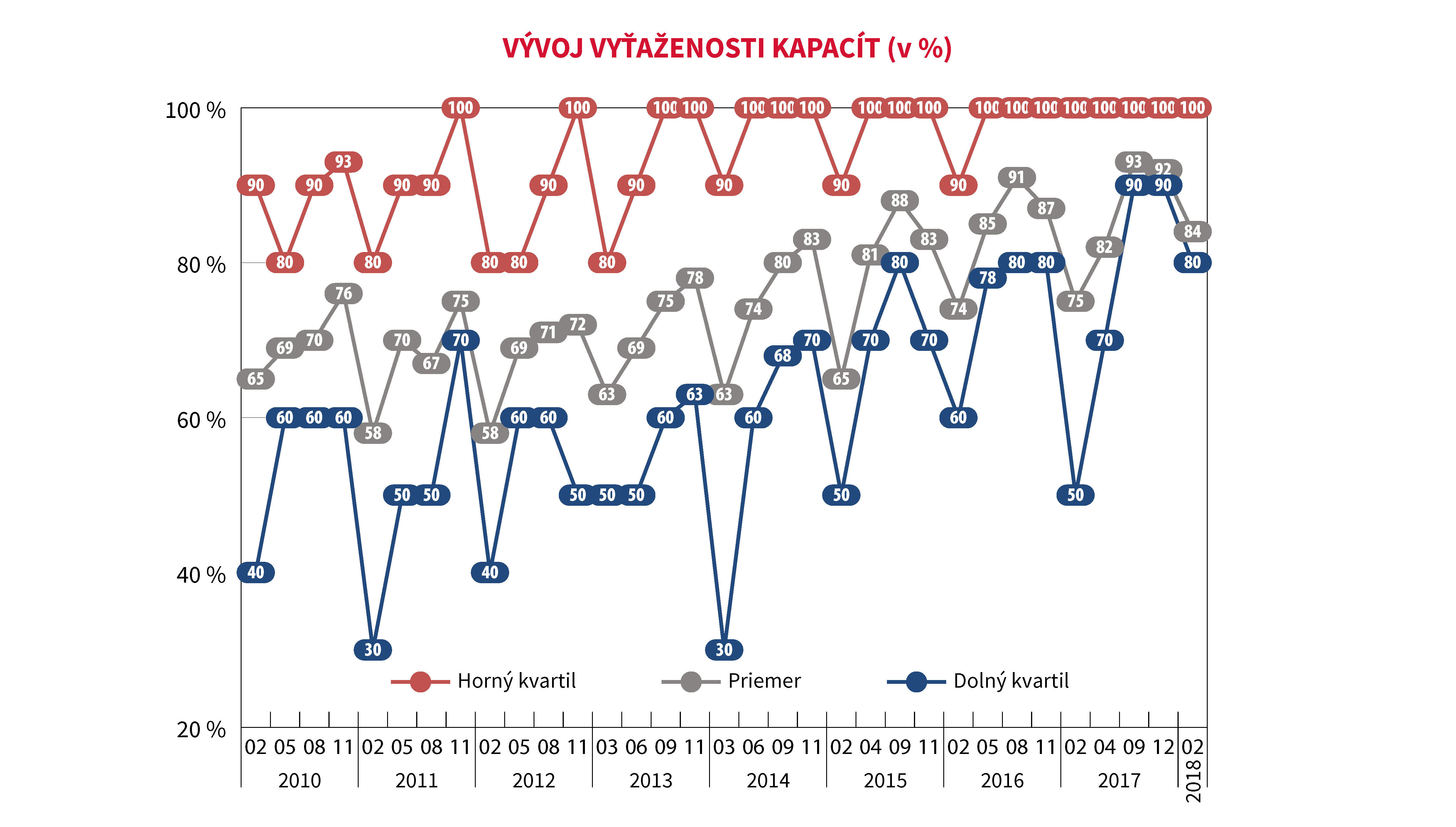 V zimných mesiacoch dosiahlo vyťaženie kapacít stavebných spoločností rekordných 84 percent. Stavebné spoločnosti zamerané na pozemné staviteľstvo sú vyťažené ešte o jeden percentný bod viac, inžinierske spoločnosti disponujú väčšou rezervou (kapacitne sú vyťažené na 79 percent). Viac ako polovica (55 percent) riaditeľov stavebných spoločností ponechá rozsah svojich kapacít na rovnakej úrovni. Navýšenie kapacít plánuje 41 percent stavebných spoločností, v priemere o 23 percent.