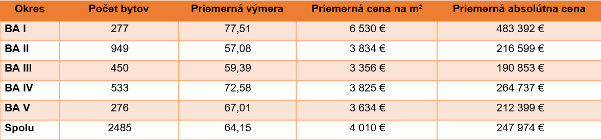 Priemerná absolútna cena bytov sa vyšplhala na 248 tisíc € vrátane DPH, čo medziročne predstavuje nárast o 6,7 %. Oproti cene na štvorec tak absolútna cena rástla výrazne pomalšie. Dôvodom je medziročný pokles priemernej rozlohy bytov z 67,7 m² na 64,2 m². Ponuka sa tak rozšírila najmä o byty s nižšou obytnou plochou, čo čiastočne kompenzuje rastúcu jednotkovú cenu. Jediný okres s priemernou absolútnou cenou do 200 tisíc € vrátane DPH je BA III, kde väčšinu ponuky tvoria malé byty v okrajových častiach okresu.