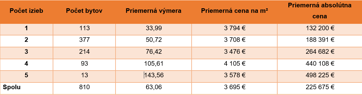 Tabuľka 2: Špecifiká predaných novostavieb v Bratislave rozdelené podľa počtu izieb (2.Q.2021)