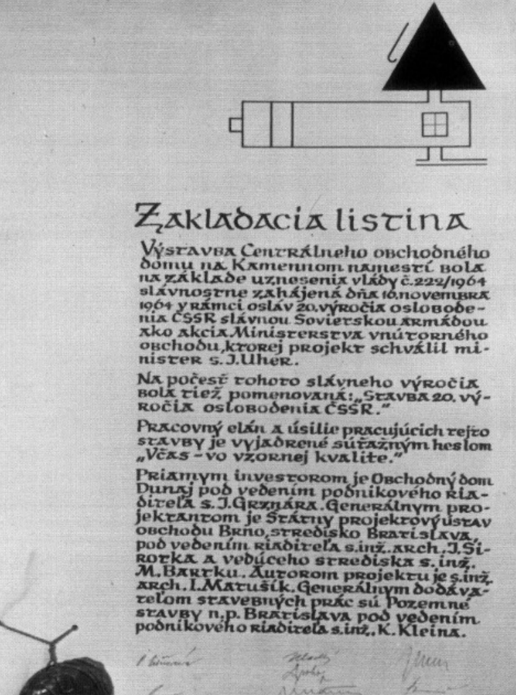 Podľa zakladacej listiny výstavba Centrálneho obchodného domu na Kamennom námestí bola na základe uznesenia vlády č. 22/1964 slávnostne zahájená 16. novembra 1964 v rámci osláv 20. výročia oslobodenia ČSSR Sovietskou armádou.