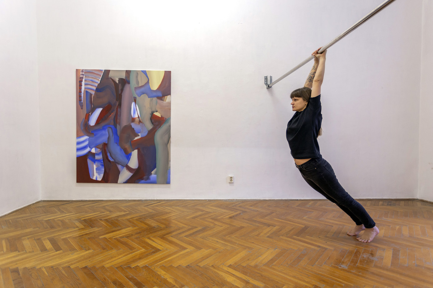 POROTA: „Maliarska prax Ludmily Hrachovinovej prehovára k súčasnému diskurzu, rozvíjanému okolo ‚zániku rozpúšťania‘ a zároveň ‚rozširovania‘ média maľby vo vzťahu k jej fyzickým okolnostiam a telám ľudí, ktorí s ňou trávia čas. Tieto experimenty a skúšanie vzbudili zvedavosť poroty do tej miery, že by ich chcela zažiť na mieste výstavy finalistov. Spôsobom spolu-fungovania maliarskeho povrchu a performujúcich tiel v priestore vyzdvihuje Hrachovinová to, čo môže (z)bežnému pohľadu uniknúť, a síce, že maľba, podobne ako tanec, je k času sa vzťahujúca skúsenosť a čas je hodnotnou integrálnou súčasťou vnímania fyzického maliarskeho diela.“