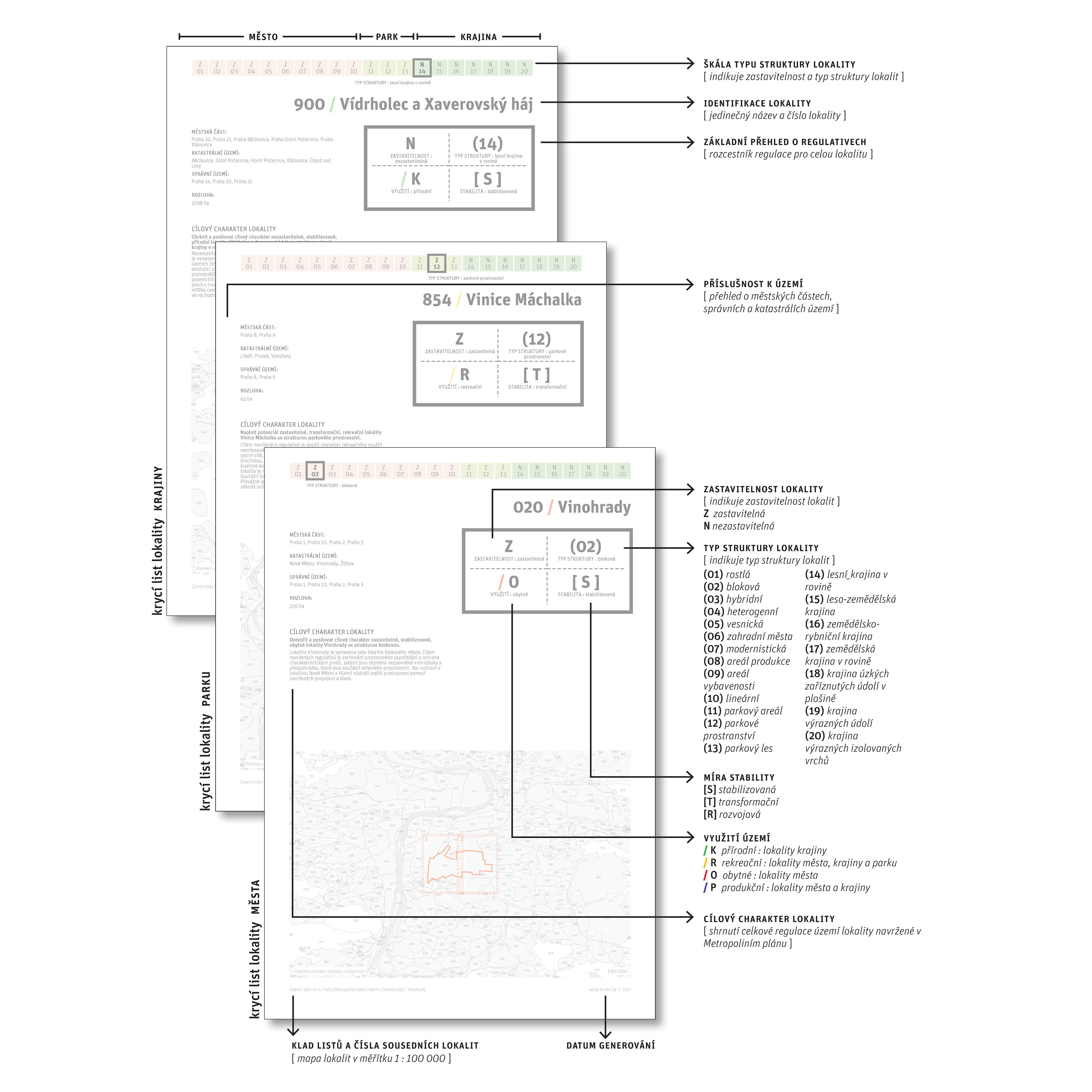 Každá lokalita má 4 vlastnosti: zastaviteľnosť, štruktúru, využitie, stabilita + navrhované riešenie štruktúry a infraštruktúry. Regulatívy v našom ponímaní v Metropolitnom pláne nenájdete. Tie sú budú predmetom iných územno-plánovacích dokumentácií. Nie mierka 1:5000, ale 1: 10 000 a iná štruktúra výkresov. Metropolitný plán Praha obsahuje okrem návrhu aj časť Odôvodnenie, texty aj výkresy (príloha, štruktúra plánu).