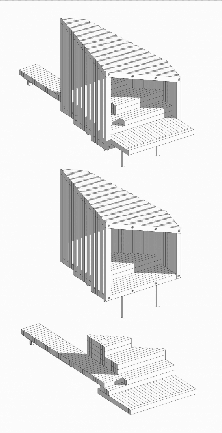 „Návštevníka privedie do objektu zdvíhajúca sa lávka a cez úzky vstup príde do krytého priestoru s terasovým sedením a výhľadom na prírodu. Celý objekt je osadený na oceľových vrutoch a navrhnutý z jedného typu smrekovcových hranolov, čo umožnilo využiť lokálny materiál na výstavbu,” vysvetlil Marcel Dzurilla, riaditeľ sekcie tvorby mestských priestorov z Metropolitného inštitútu Bratislavy.