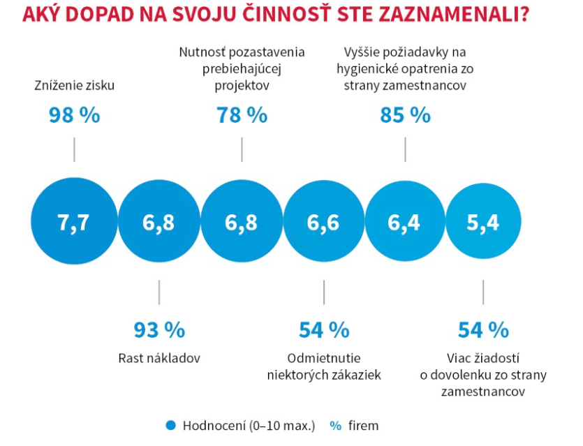 Koronavírus a s ním zavedené opatrenia majú dopad na činnosť deviatich z desiatich opýtaných spoločností (92 %). V najväčšej miere sa jedná o dopad na zníženie zisku spoločnosti (7,7 bodov z 10). Ďalej spoločnosti tiež zaznamenali rast nákladov, alebo boli nútené pozastaviť prebiehajúce projekty (oboje zhodne 6,8 bodov). Opatrenia tiež mali vplyv na zrušenie niektorých zákaziek spoločností (6,6 bodov z 10) a spoločnosti boli nútené zvýšiť hygienické opatrenia na pracovisku (6,4 bodov z 10). Dopad tiež spoločnosti pociťujú zo strany svojich zamestnancov, kedy zaznamenali väčší záujem o dovolenku z ich strany (5,4 bodov z 10).