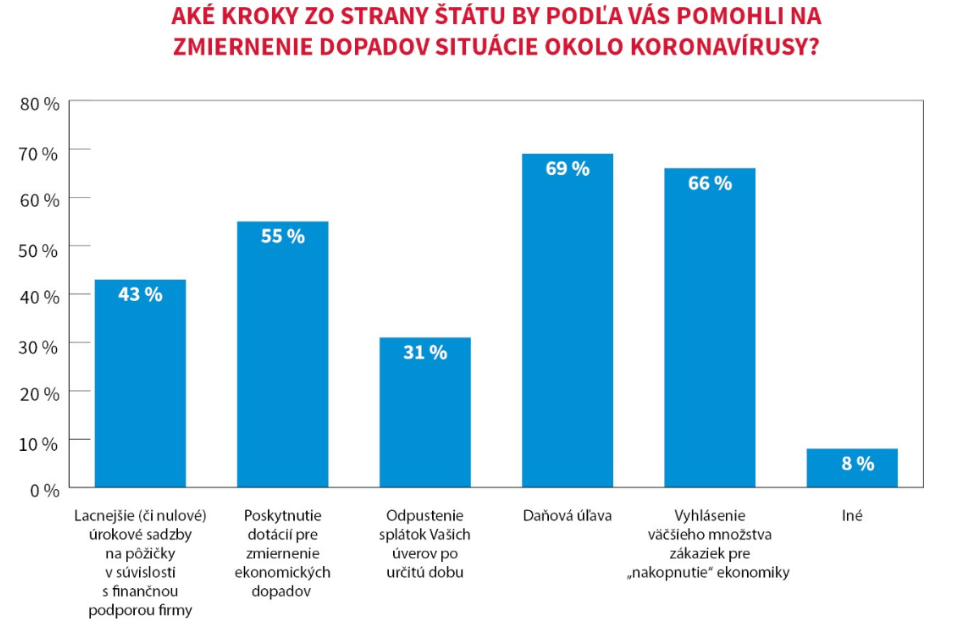 Zo strany štátu by k zmierneniu ekonomických dopadov súčasnej situácie, podľa projektových spoločností, najviac pomohla daňová úľava (69 %) a vyhlásenie väčšieho množstva verejných zákaziek (66 %). Ďalej by viac ako polovica spoločností uvítala poskytnutie dotácií zo strany štátu (55 %) a menej ako polovica by bola pre zníženie úrokových sadzieb (prípadne pre nulové úrokové sadzby) u pôžičiek v súvislosti s finančnou podporou firmy (43 %). Tretina by sa priklonila k odpusteniu splátok úverov firmy na určitú dobu (31 %). Takmer desatina (8 %) by volila aj inú formu podpory ako je napríklad preplatenie časti platu zamestnanca zo strany štátu alebo rýchlejšiu prácu úradov. Pavol Kováčik, prezident Sväzu stavebných podnikatel´ov Slovenska upozorňuje na dôležitosť zameranie na investície zo strany štátu: „Aktuálne opatrenia sú zamerané predovšetkým malým podnikateľom v obchode a službách. Nie sú orientované na stavebné spoločnosti, či už zamerané na samotnú výstavbu alebo projektové a inžinierske činnosti. Z dlhodobého hľadiska je neudržateľné riešiť situáciu dotáciami na udržanie pracovných miest, je potrebné aj zameranie na investície, ktoré utlmia prepad a opätovne rozhýbu ekonomiku.“