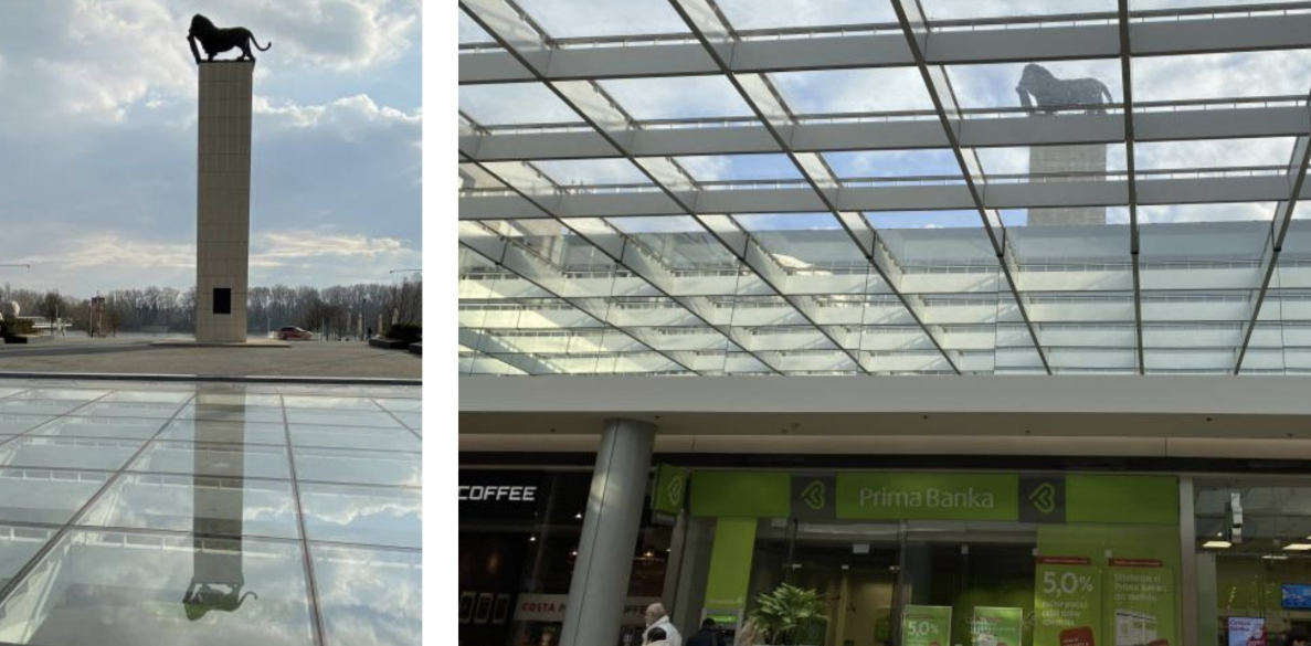 Autorom architektonického riešenia bol Ivan Salay a sochu reštauroval ak. soch. prof. Jozef Porubovič. Tu bol pod označením „socha na pilieri“ za roku 1990 lev vyhlásený za Národnú kultúrnu pamiatku č. MK SR-3420/1990-32 ako pomník československej štátnosti a tu vydržal až do roku 2008, keď sa stal súčasťou koncepcie znovupostavenia Štefánikovho pamätníka. Na mieste pred múzeom pylón na krátku dobu ostal bez leva.
