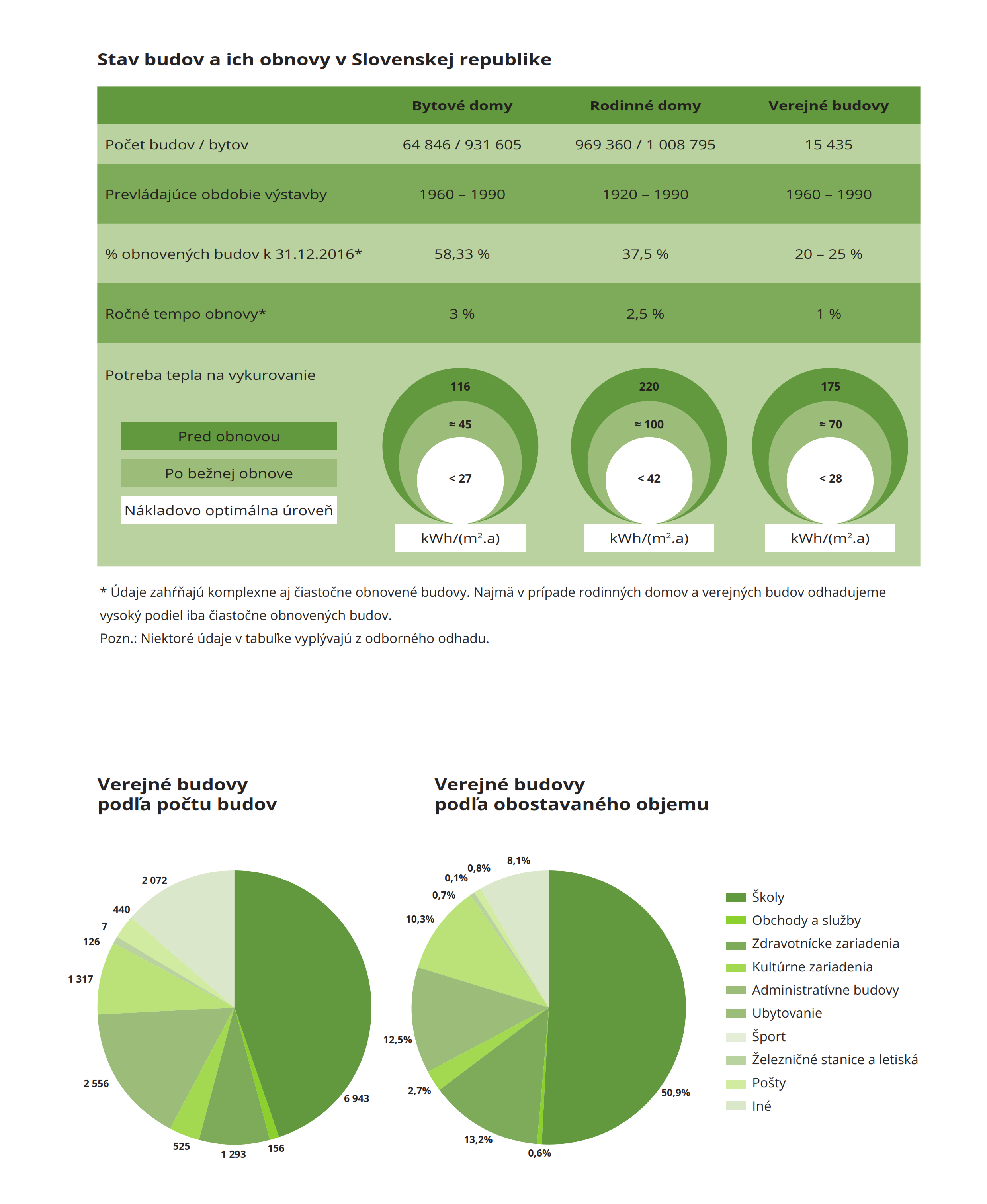 Fond bytov a budov na Slovensku, podobne ako inde vo svete, tvoria v prevažnej miere budovy, ktoré sú v polovici svojej životnosti alebo staršie. Zároveň však boli postavené naj- mä v období po roku 1960, sú teda relatívne mladé a predpokladáme, že aj pri zrýchlenom tempe asanácie (aktuálne napr. úbytok bytov 1 200 až 1 400 ročne) bude v roku 2050 stáť viac ako 90 % súčasných budov. Navyše segment bytových domov realizovaný masovou formou výstavby, ale aj veľká časť rodinných domov („katalógové projekty“), školských či zdravotníckych budov sa vyznačujú vo všeobecnosti dobrými dispozičnými riešeniami, dobrými možnosťami prirodzeného osvetlenia a tiež technicky dobrou realizovateľnosťou opatrení na zateplenie a iné modernizačné opatrenia. Dosiahnutie plného potenciálu životnosti budov je podmienené ich pravidelnou a kvalitnou údržbou a komplexnou obnovou, minimálne raz za 30 rokov. Zanedbanie obnovy vedie k predčasnému vyradeniu budovy z používania. Nahradenie zvýšeného úbytku existujúcich budov novostavbami by bolo pravdepodobne veľmi náročné najmä pre verejné rozpočty, dá sa totiž predpokladať, že obyvatelia vyradených budov nebudú finančne pripravení zabezpečiť si náhradné bývanie.