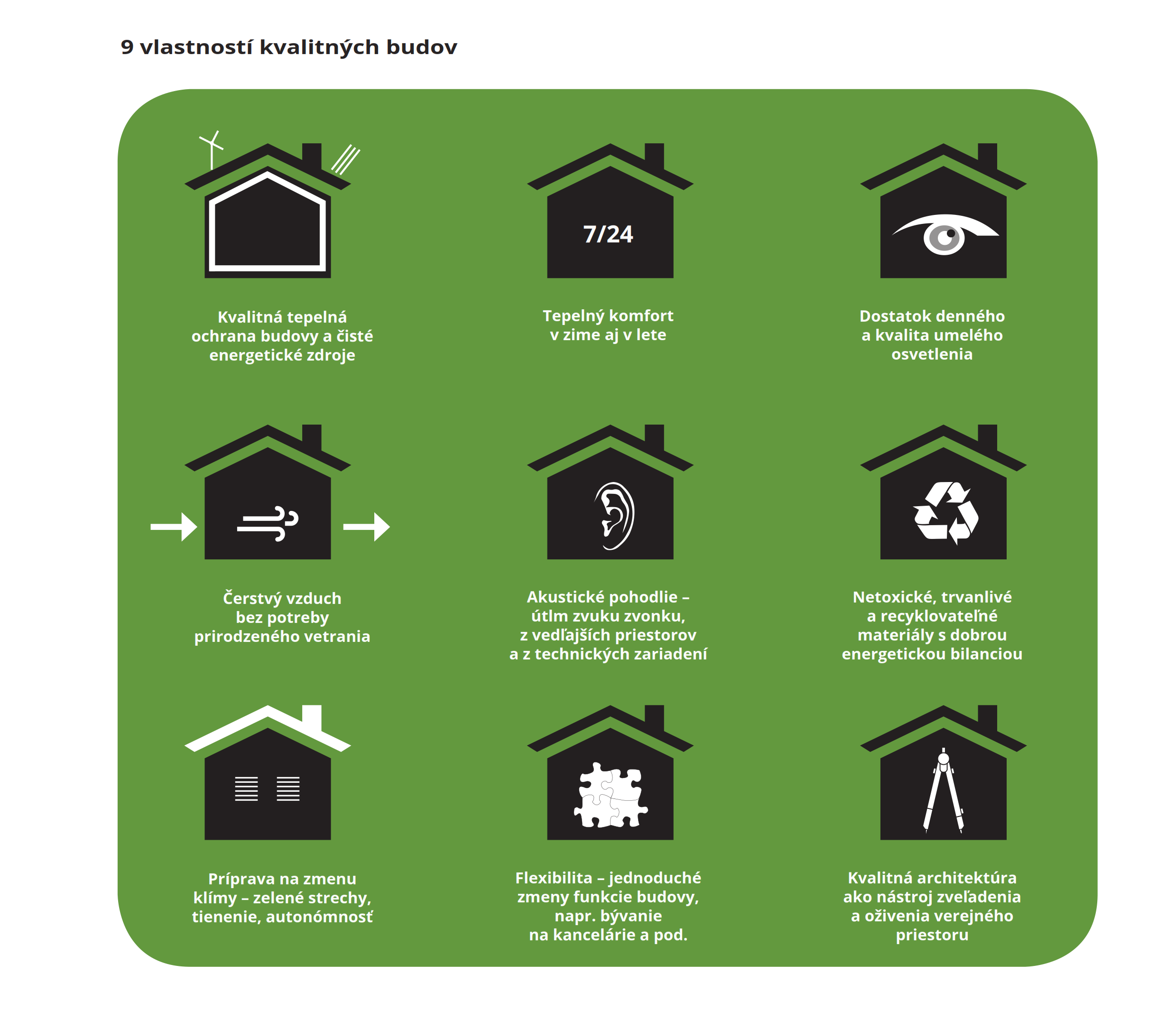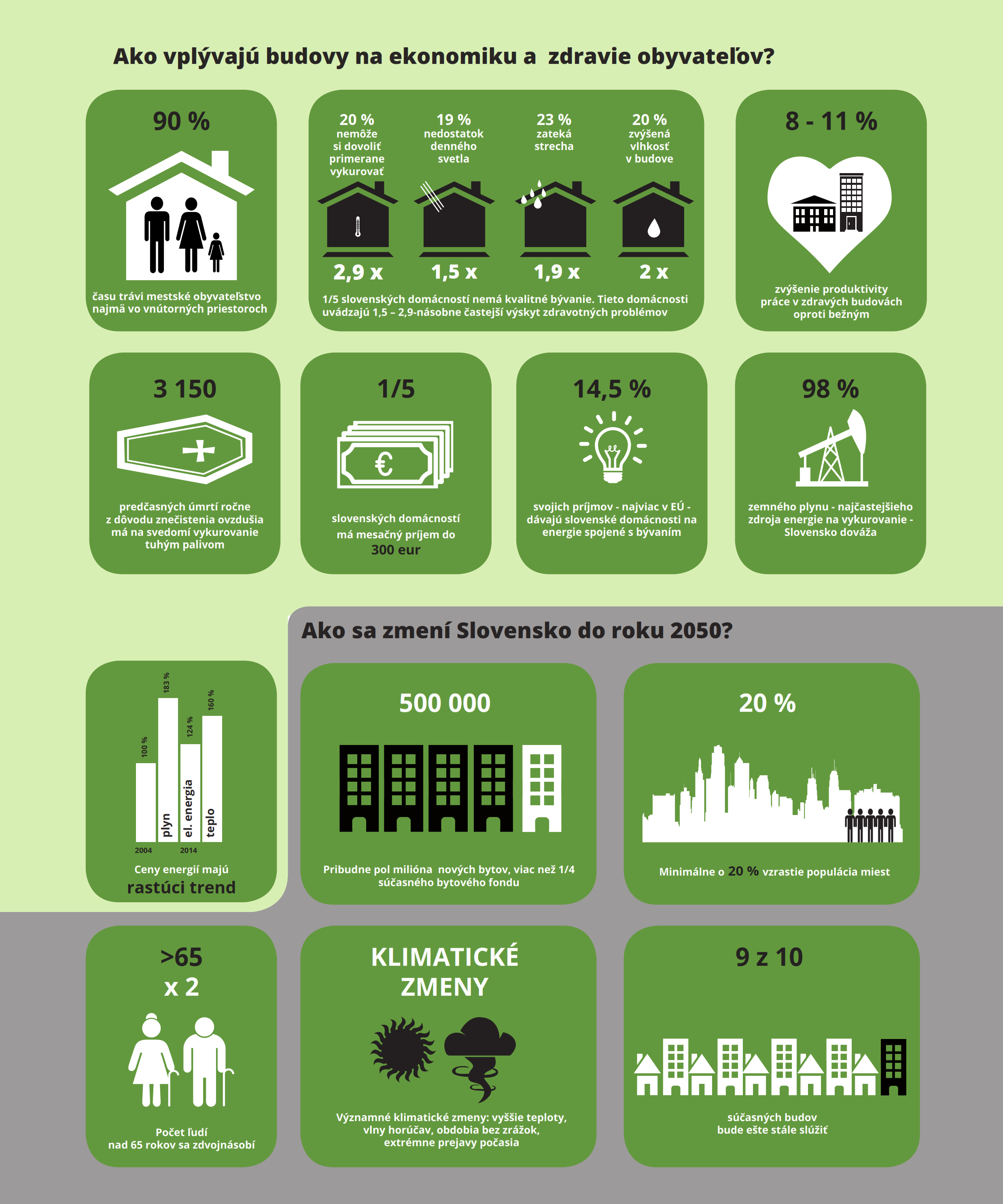Budovy sú, prirodzene, dôležité pre každého z nás, pretože v nich bývame a pracujeme. Navyše, najmä mestské obyvateľstvo trávi vo vnútorných priestoroch až 90 % času. Smutným faktom však je, že aj v 21. storočí uvádza až pätina slovenských domácností, že si doma nemôže dovoliť udržiavať primerané teplo, presakuje im strecha, trpia vlhkosťou či plesňami a majú doma málo denného svetla. Tieto domácnosti zároveň uvádzajú 1,5 až 2,9-násobne častejší výskyt zdravotných problémov. Na druhej strane je preukázané, že ľudia majú v zdravých (kancelárskych) budovách o 8 až 11 % vyššiu produktivitu práce a že obchodné prevádzky dosahujú merateľne lepšie výsledky, ak sú umiestnené v kvalitných budovách. V budovách sa spotrebuje 40 % všetkej energie, Slovensko je od dovozu energetických zdrojov takmer úplne závislé a patrí medzi energeticky najnáročnejšie ekonomiky v Európskej únii. Z tohto pohľadu sú budovy a ich kvalita dôležité pre celú spoločnosť a jej ekonomickú výkonnosť, pretože tá je závislá od zdravej a produktívnej populácie, ale aj energetickej bezpečnosti krajiny.