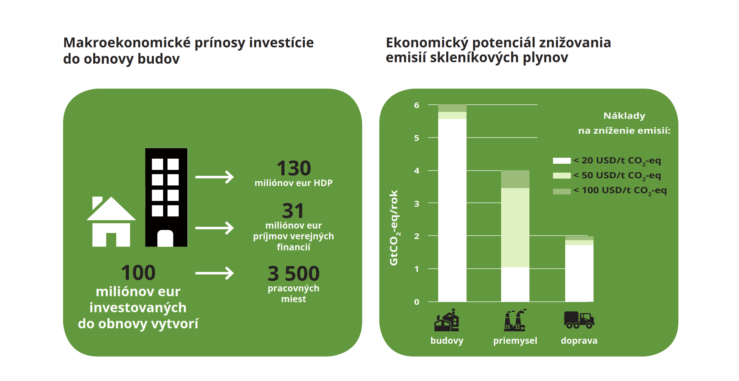 Dlhodobo prosperujúce Slovensko potrebuje zdravých a produktívnych ľudí. Na to potrebuje budovy, ktoré budú energeticky hospodárne, napojené na čisté, najmä obnoviteľné zdroje energie, s kvalitným vnútorným prostredím a adaptované na nové klimatické podmienky. Po technickej a ekonomickej stránke sú takéto budovy uskutočniteľné na Slovensku už dnes. Napriek tomu je vyhovujúcich budov medzi obnovenými a novými budovami zatiaľ len veľmi málo.