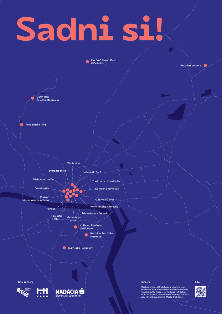 Od 7. mája Sadni si! nájdete na Primaciálnom námestí aj vo dvore Primaciálneho námestia. Pred Mestskou knižnicou na Kapucínskej ulici, v neobjavenom Hummelovom dvorčeku na Klobučníckej ulici, na Námestí SNP, pred Kunsthalle na Treskoňovej ulici, na Kamennom námestí, na Komenského námestí a tiež po prvýkrát na Obchodnej ulici. Mimo centra nájdu sety aj pri Knižnici v Petržalke, na námestí vo Vajnoroch a ďalších obľúbených lokalitách pri vstupoch do Mestských lesov Bratislavy. Postupne v priebehu tejto sezóny pribudne na rôzne lokality v centre, ale aj ďalších mestských častiach takmer 300 červených stoličiek.