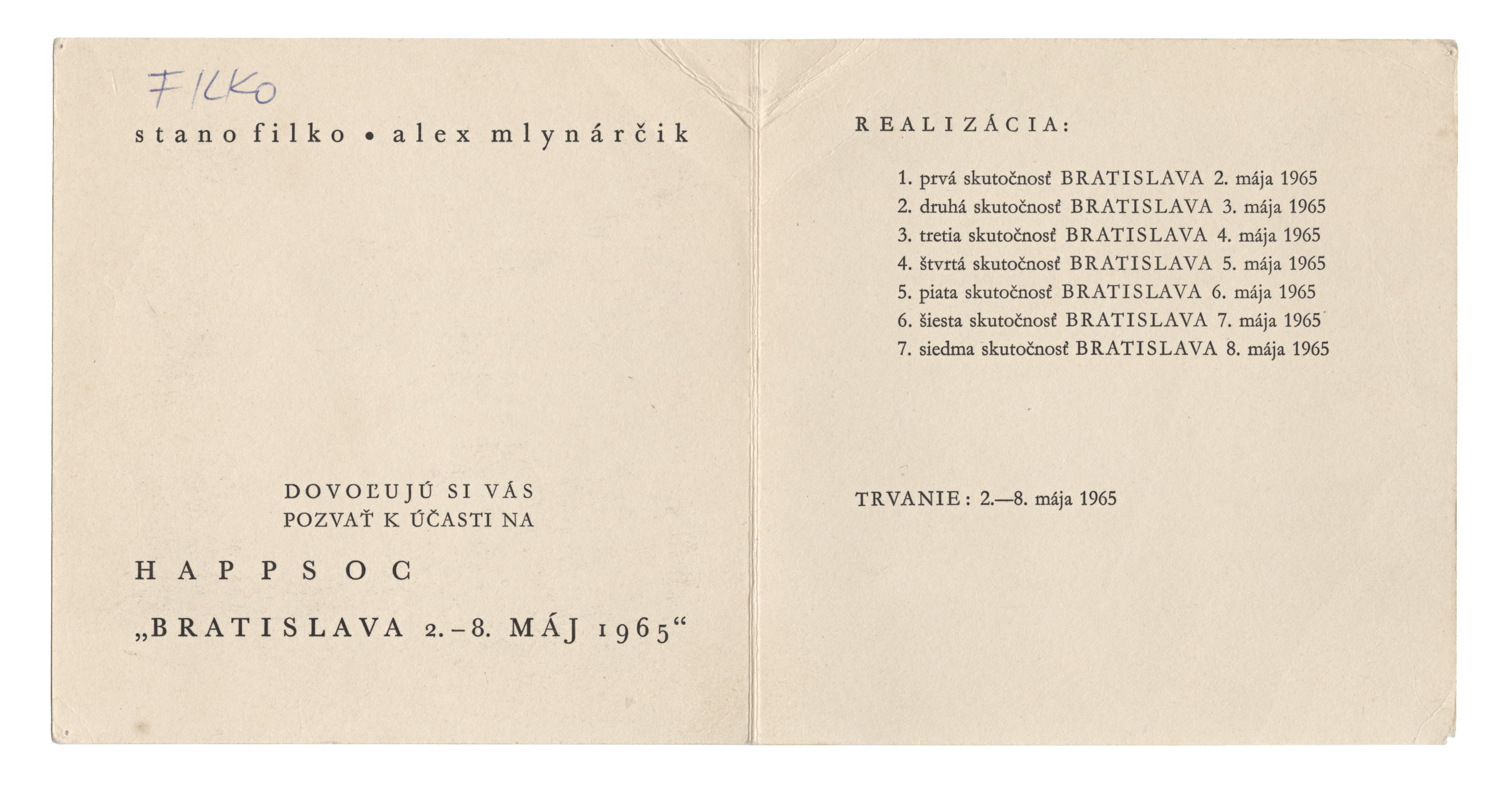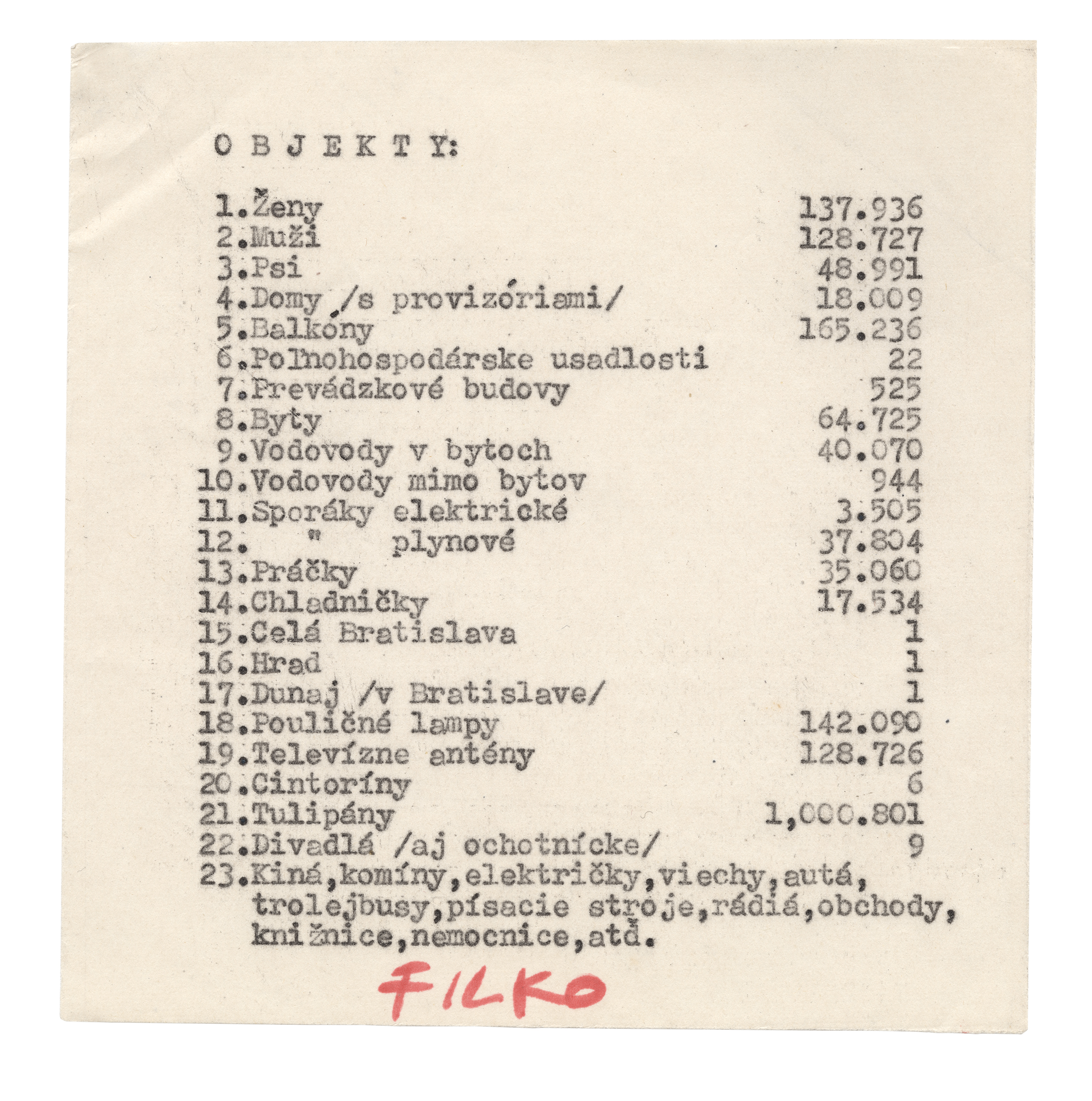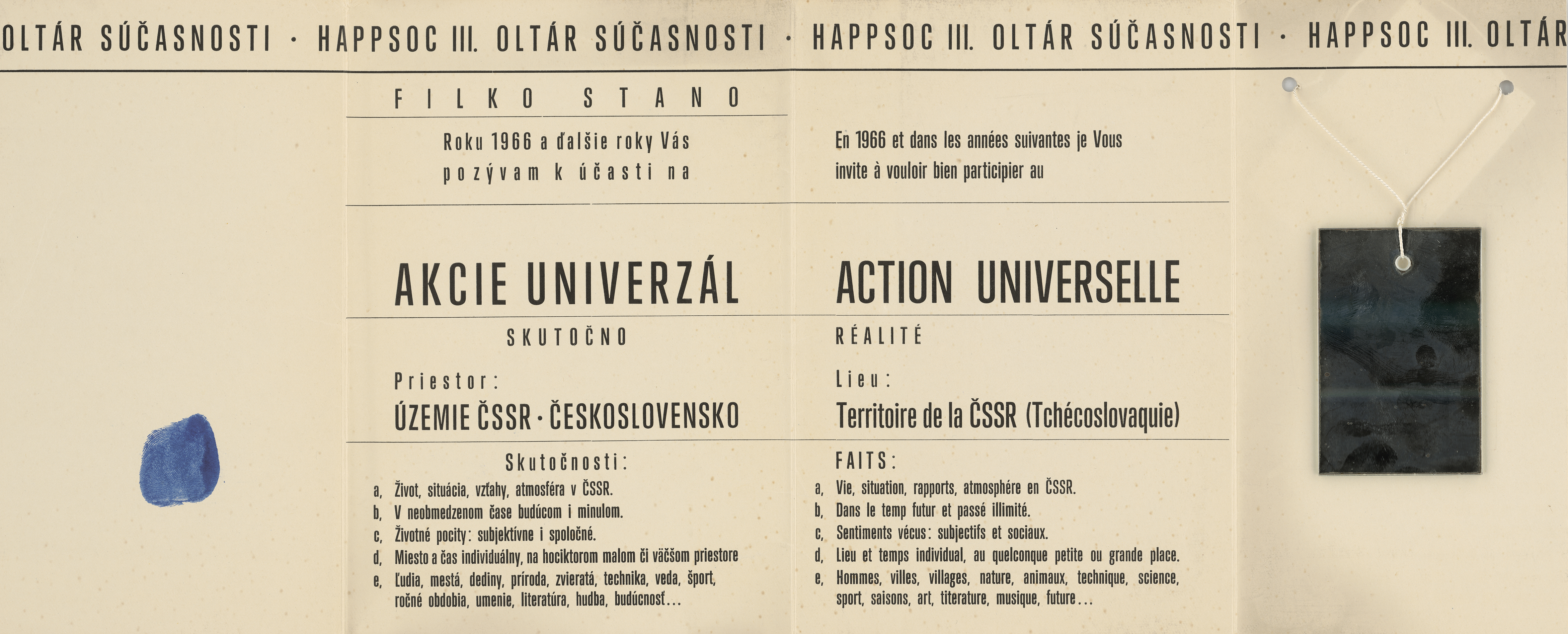 Zbierka a archív Stana Filka z majetku dedičov Stana Filka deponovaná v SNG (Zbierka SF, SNG a Archív SF, SNG) | Collection and Archive of Stano Filko courtesy heirs of Stano Filko researched at SNG, Bratislava; Zbierka Linea | Linea Collection, Bratislava; Zbierka Prvej slovenskej investičnej skupiny, a. s., Bratislava | Collection of the First Slovak Investment Group, a. s., Bratislava (PSIS); Galéria mesta Bratislavy | Bratislava City Gallery, Bratislava; Stredoslovenská galéria | Central Slovakian Gallery, Banská Bystrica (SGBB); Dušan Brozman, Ivan Jančár, Michal M. Murin, Rudolf Sikora and others