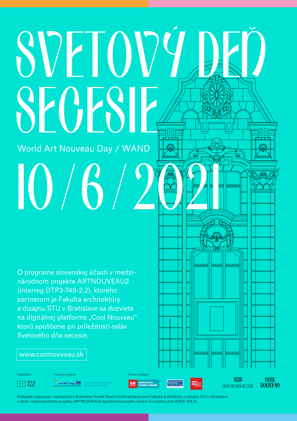 Oslavy Svetového dňa secesie (World Art Nouveau day – WAND) prichádzajú do Bratislavy vďaka medzinárodnému projektu Art Nouveau 2, podporovaného v rámci Dunajského nadnárodného programu. Slovenský partner projektu je Fakulta architektúry a dizajnu STU v Bratislave, ktorá pri tejto príležitosti spúšťa digitálnu platformu www.coolnouveau.sk, ktorá bude pravidelne prinášať výsledky výskumu realizovaného v rámci projektu ale aj upozorňovať na podujatia, ktoré sa v súvislosti s projektom uskutočnia.