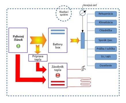 Moderný systém s PČ (obrázok č. 1) je schopný na základe riadiaceho systému, ktorý bude na základe potreby tepla, teplej vody a elektrickej energie pre domáce spotrebiče smerovať energiu podľa požiadaviek. Teplo vyrobené v palivovom článku bude slúžiť na prípravu teplej vody a vykurovanie. V prípade potreby väčšieho tepelného výkonu časť vyrobenej elektrickej energie je využitá na výrobu tepla. Zvyšná elektrická energia bude uskladnená v battery boxe a pripravená na okamžitý odber. Riadiace systémy tohto druhu sa „učia“ (Machine learning) predvídať potrebu elektrickej energie jednotlivými spotrebičmi, riadi prioritne regulovateľné domáce spotrebiče elektrickej energie. V prípade nedostatku el. energie alebo výkonu, systém „nakúpi“ elektrickú energiu z verejnej siete.