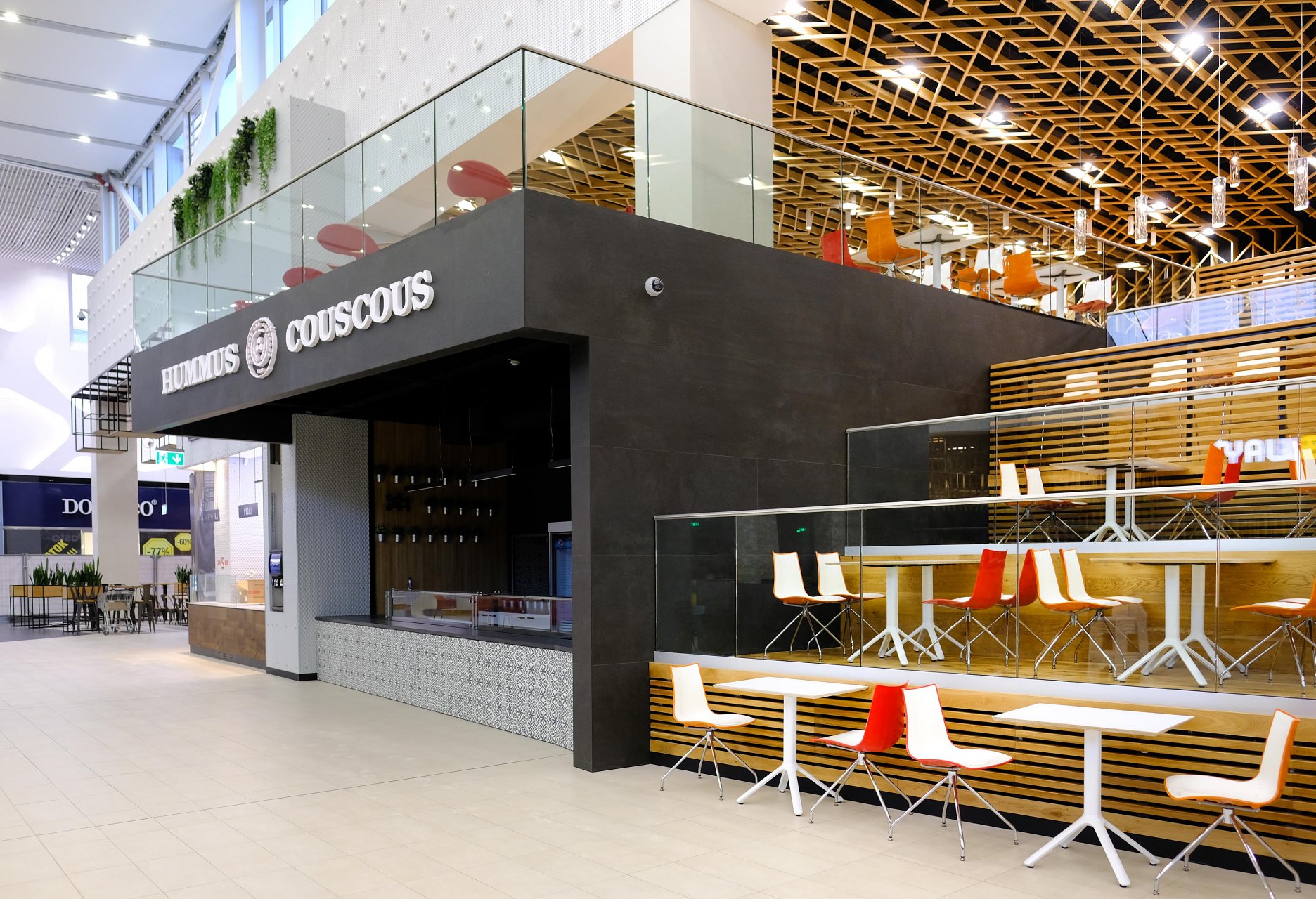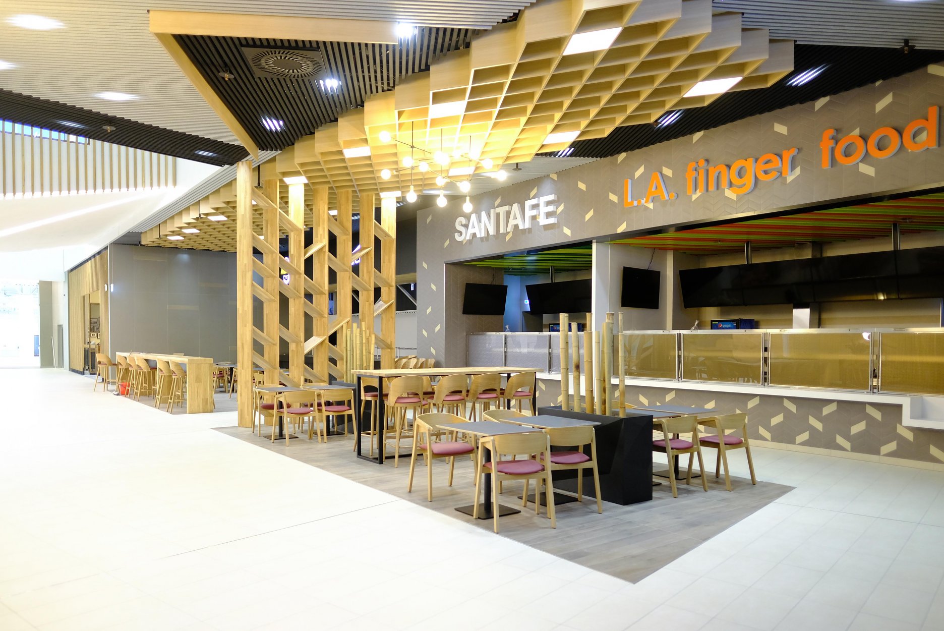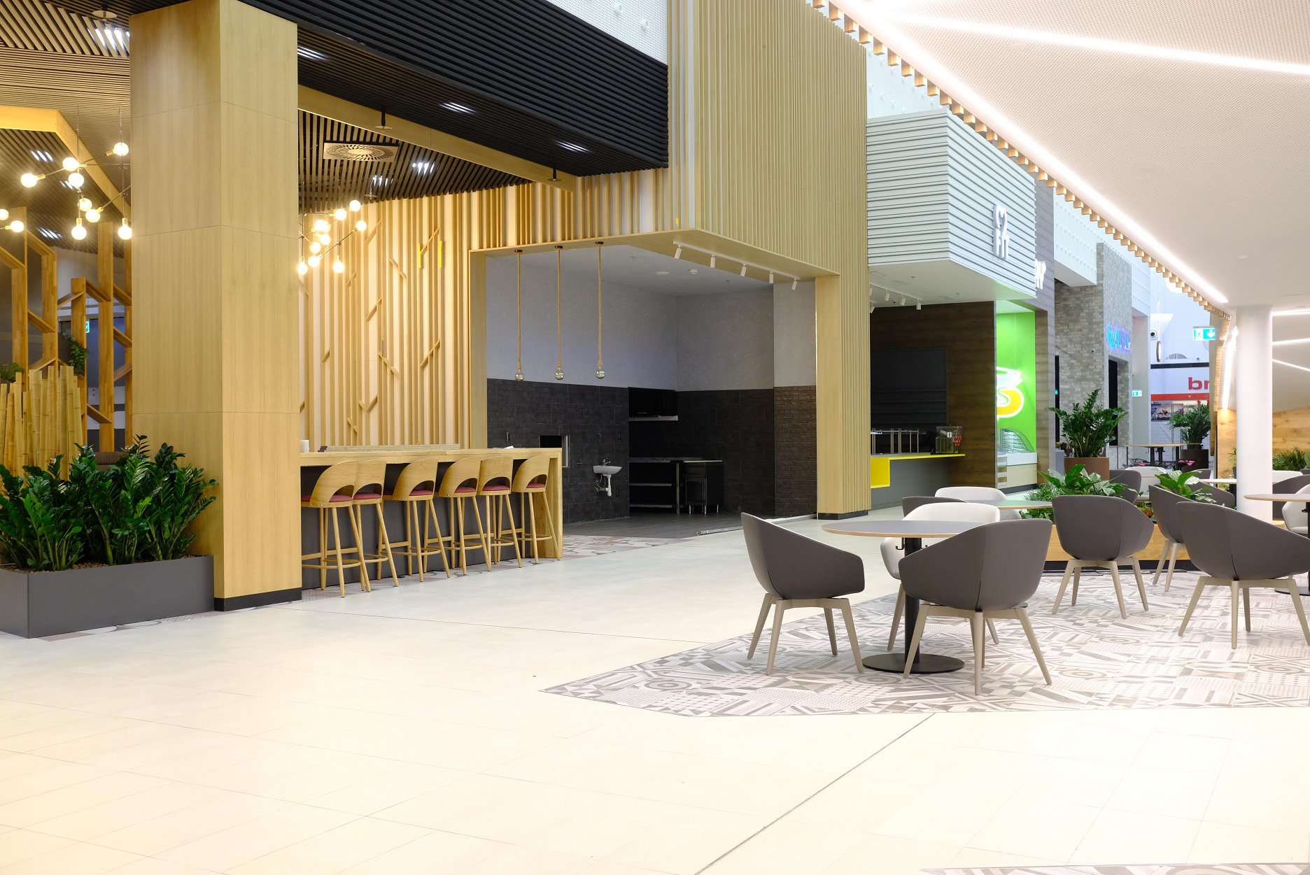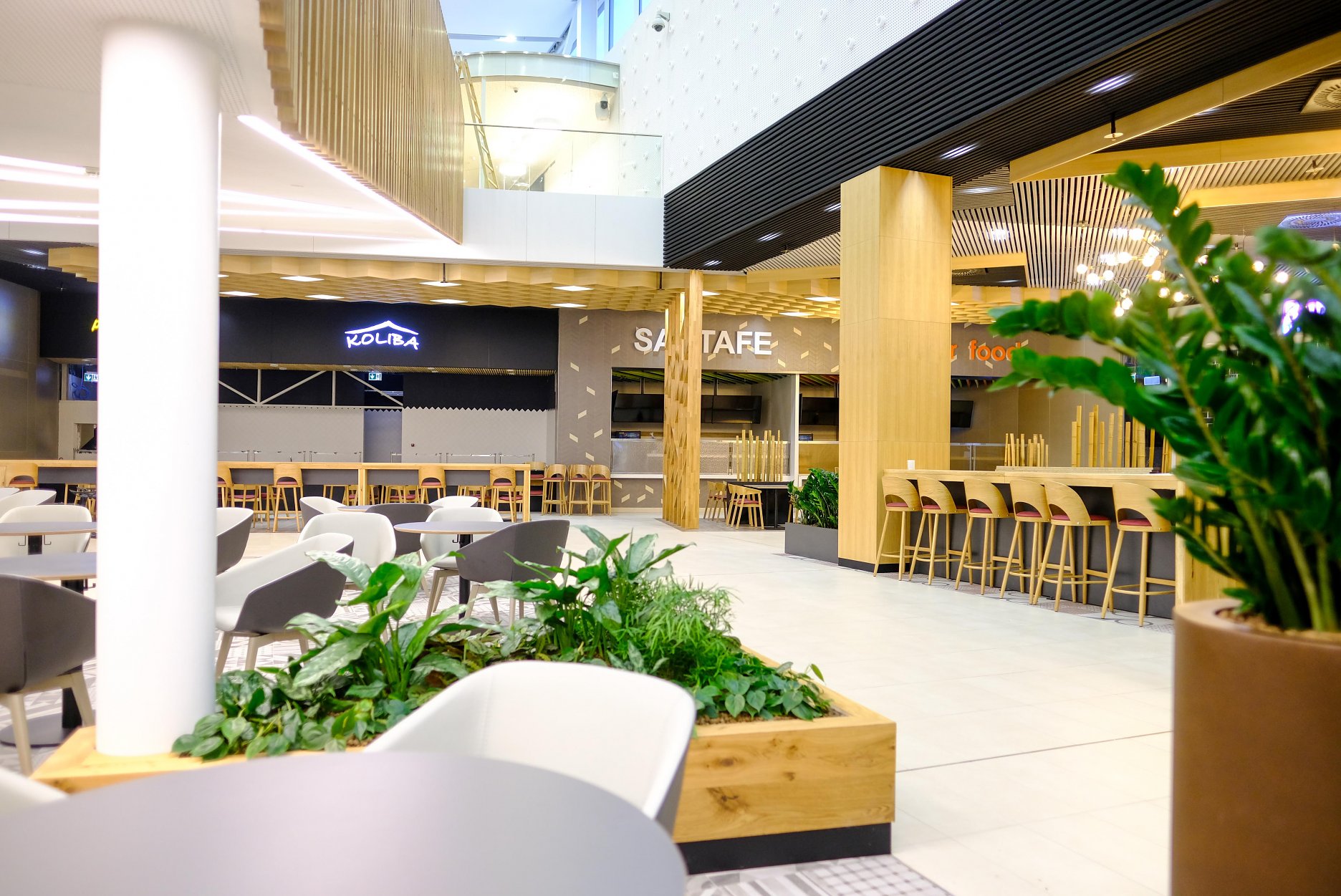 Dizajnový foodcourt v škandinávskom štýle inšpirovaný zákutiami veľkomiest pochádza z architektonickej kancelárie Pavla Suchánka. Hlavným materiálom v interiéri je množstvo prírodného dreva a sklených plôch pre denné svetlo.