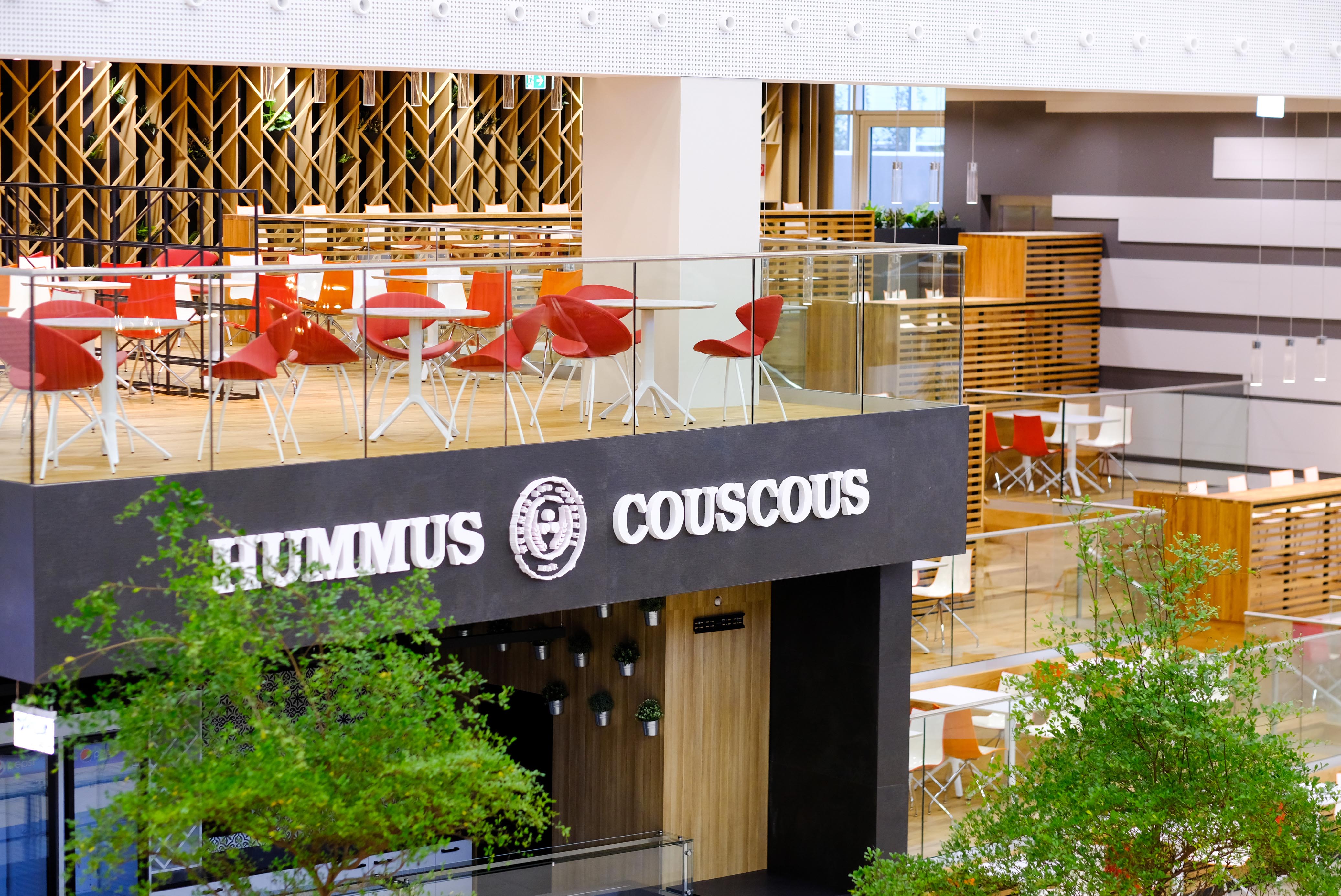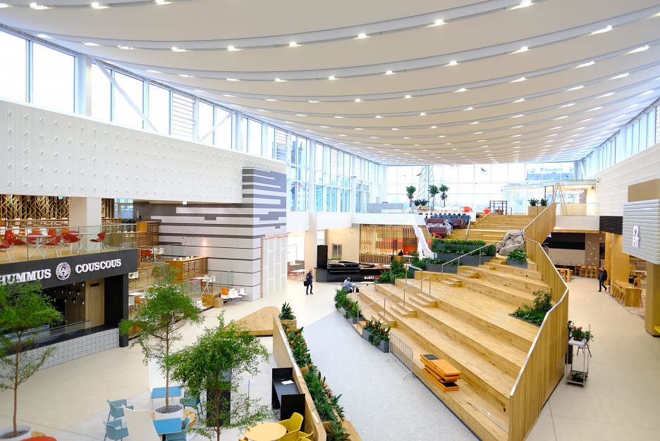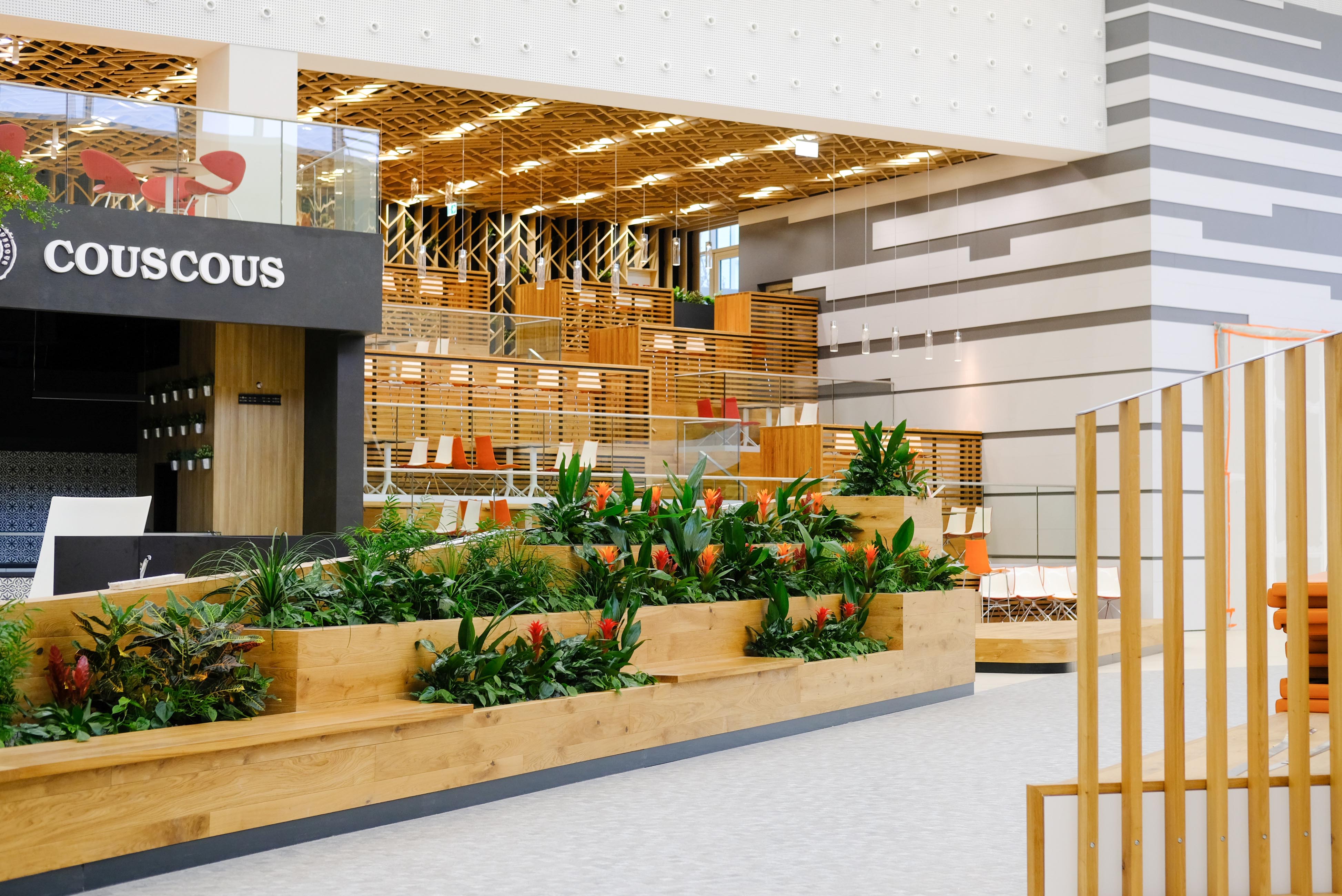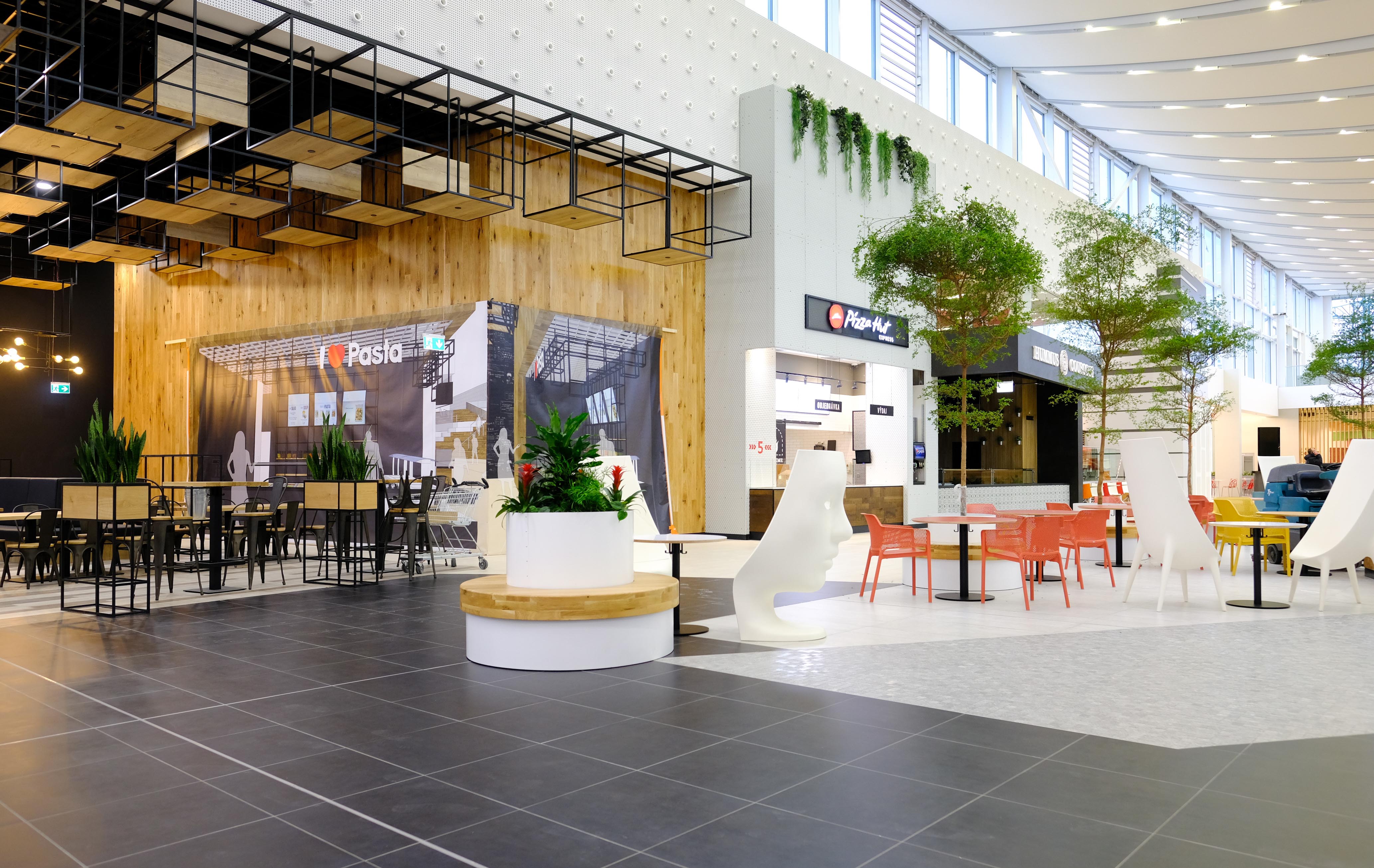 Dizajnový foodcourt v škandinávskom štýle inšpirovaný zákutiami veľkomiest pochádza z architektonickej kancelárie Pavla Suchánka. Hlavným materiálom v interiéri je množstvo prírodného dreva a sklených plôch pre denné svetlo.