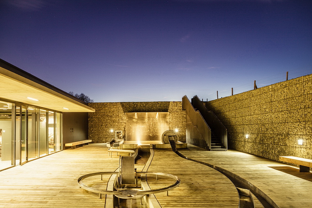 Určujícím faktorem celkového architektonického pojetí je kontext volné krajiny v okolí vodní nádrže Švihov – objekt je navržen tak, aby přirozeně splynul s okolím. Jednoduchý přízemní objekt je částečně zapuštěn do terénu, z vnějšku tvoří archetypální kamennou stavbu ve volné krajině, tak jak ji známe již po staletí. Inspirací a přirozeným východiskem pro návrh je zmíněný archetyp solitérní stavby ve volné krajině jako jsou hřbitovy obehnané kamennou zdí, kostely, hrady, statky, usedlosti apod. Veškeré prvky a detaily v exteriéru respektují myšlenku maximální jednoduchosti a čistoty, které jsou adekvátní danému prostředí a poslání objektu. Objekt je vymezen kamennými gabionovými stěnami na obdélném půdorysu. Uvnitř stěn je navržen samotný objekt a navazující atrium. Z atria může návštěvník vstoupit do vnitřní expozice domu nebo po subtilním ocelovém schodišti vystoupat na návštěvnickou naučnou stezku kolem expoziční nádrže, mokřadu, suchého poldru a dalších zajímavostí. Atrium domu nabízí návštěvníkům venkovní expozici s vodními hrátkami, fontánami a vodopádem. Ve dřevěné palubě jsou nerezová a betonová korýtka s proudící vodou, kde si návštěvníci mohou vyzkoušet jak funguje Archimédův šroub, nebo třeba pustit lodičku.