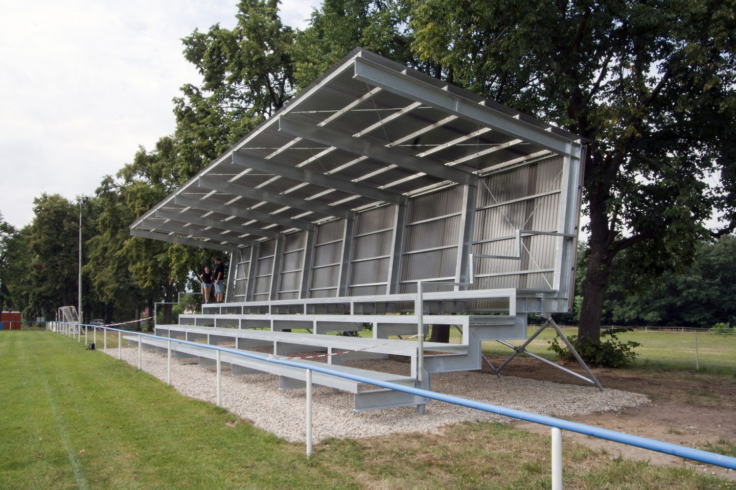 Tribuna je opakovatelná, modulová, ocelová konstrukce s dřevěnými lavicemi pro 73 diváků. Postaveno je 7 modulů o šířce 2,4 m, v budoucnu lze tribunu libovolně rozšiřovat o další moduly. Ortogonální rámy jsou podepřené příhradovou skloněnou konstrukcí z ocelových trubek, tribuna levituje nad trávníkem. Záda a střecha tribuny jsou opláštěné vlnitým průsvitným polykarbonátem. Jednotlivé stupně tvoří ocelové nosné pororošty, na nich jsou pro sedící diváky osazena dřevěná masivní prkna.