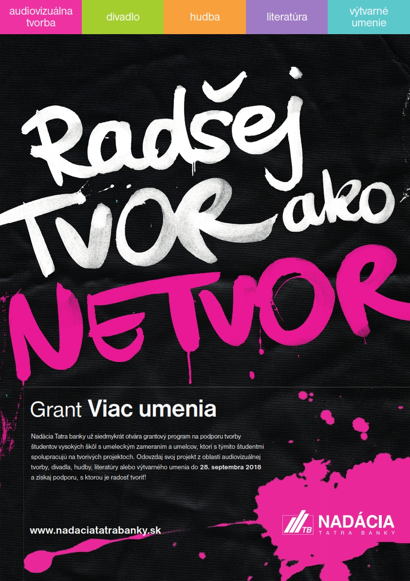 Nadácia Tatra banky už po siedmykrát otvára grantový program na podporu tvorby študentov s umeleckým zameraním a umelcov, ktorí s týmito študentmi spolupracujú na tvorivých projektoch.