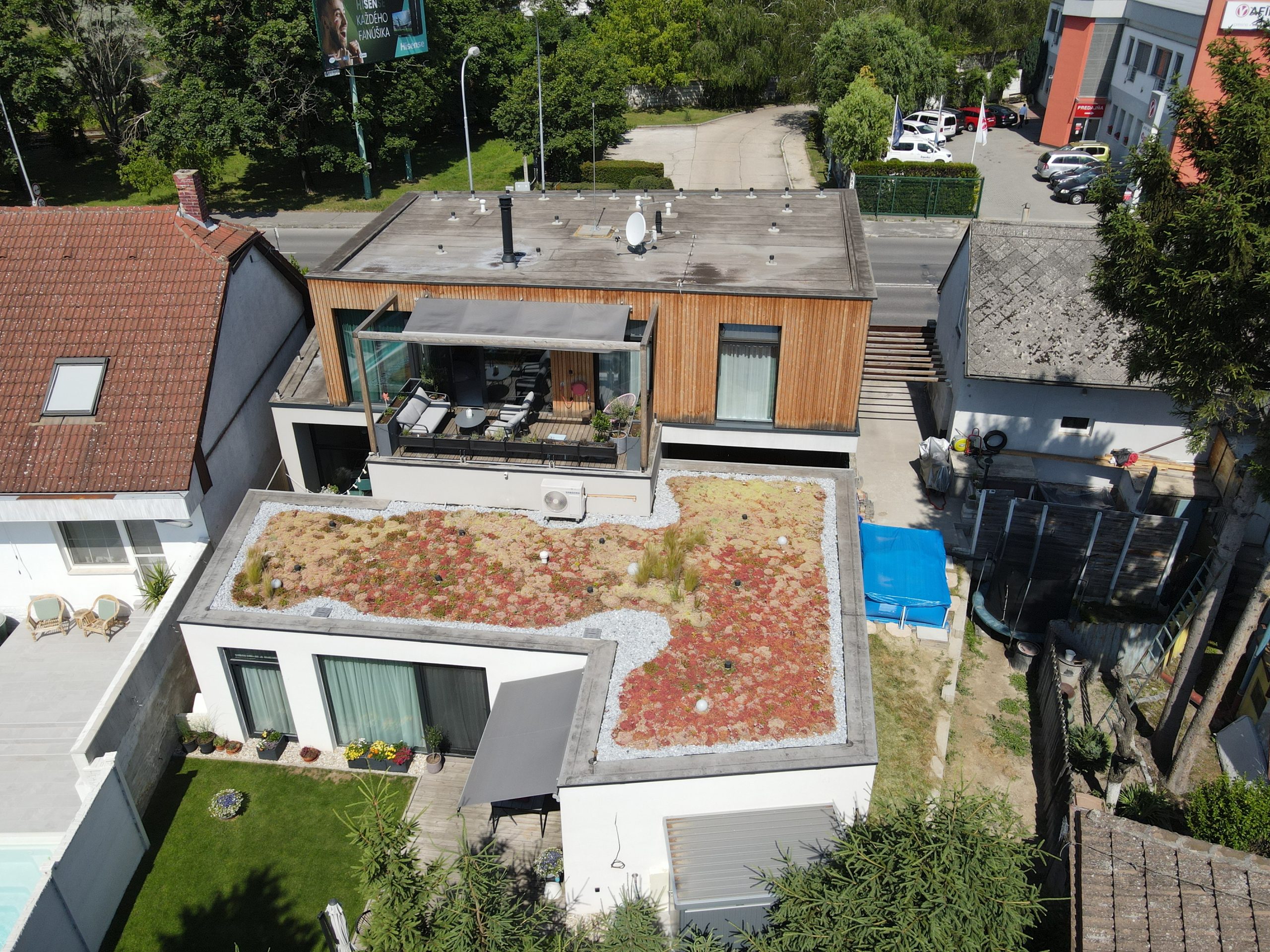 Zelená strecha na rodinnom dome Triha v Rači. Rodinný dom je spojený spolu s architektonickým ateliérom manželov. Nachádza sa v Bratislave - Rači.