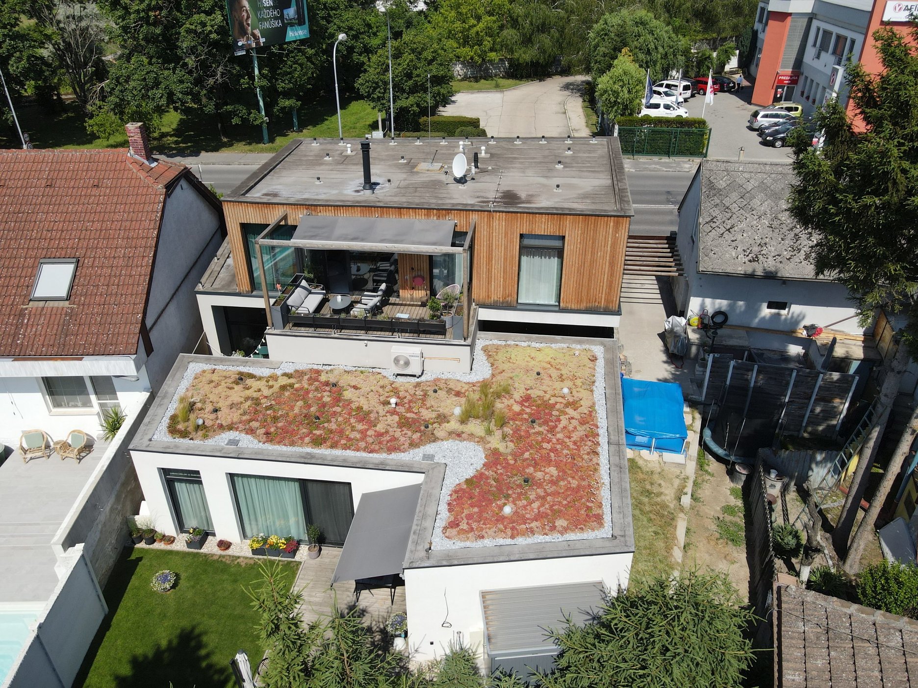 Zelená strecha o rozmere 100 m2 sa nachádza na streche rodinného domu a na strechce parkovacieho objektu. Je intenzívna a extenzívna.