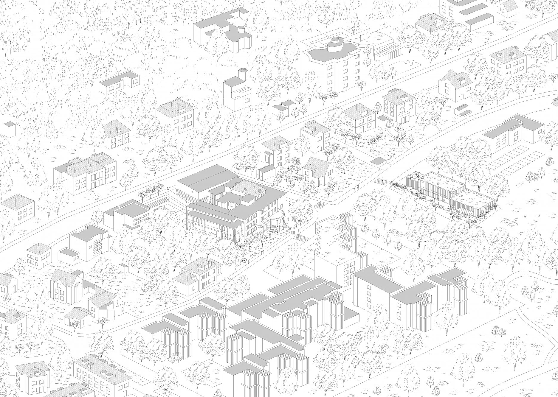 Nový objekt na pozemku 294/1 je členěn jako konglomerát objemů či „boxů“, čímž reaguje na měřítko vilové čtvrti. Program je v této prostorové struktuře logicky poskládán a doplněn novými funkcemi, které dodatečně budovu aktivují.
