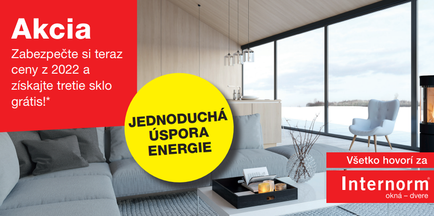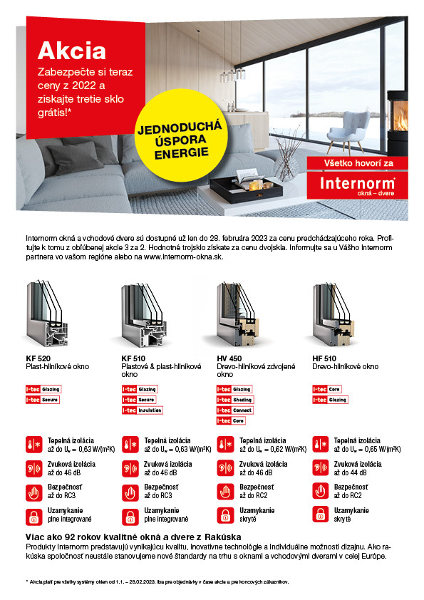 Internorm okná a vchodové dvere sú dostupné už len do 28. februára 2023 za cenu predchádzajúceho roka. Profitujte k tomu z obľúbenej akcie 3 za 2. Hodnotné trojsklo získate za cenu dvojskla.