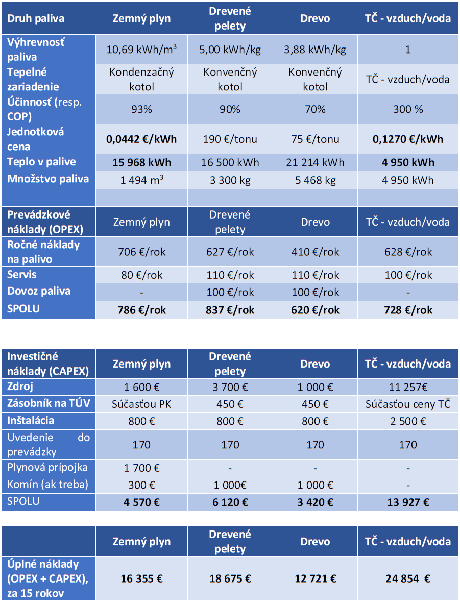 Pre účely porovnania základných zdrojov vykurovania sme si zvolili nasledujúce parametre: