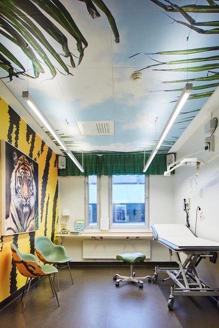 „Spokojnosť dokáže liečiť. Preto chceme, aby deti zažili v našej nemocnici zábavu,“ hovorí Tomas Gedda z nemocnice kráľovnej Silvie vo švédskom Gothenburgu. V rámci pilotného projektu boli v tomto zariadení kompletne zrekonštruované štyri izby na pohotovosti. Pre každú z nich vybrali architekti motív jedného zvieraťa žijúceho v džungli alebo na savane – jaguára, papagája, zebru a šimpanza. Každú izbu zdobia aj pohľadnice s príbehmi o tom, ako sa dané zvieratko ocitlo práve v danej v izbe.