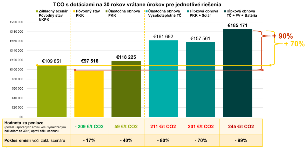 Naopak dekarbonizačné riešenie prakticky s nulovými emisiami na mieste t.j. hĺbková obnova rodinného domu s kombináciou TČ + fotovoltikou (FV) + batériou predstavuje pre dotknutú domácnosť až 70%né navýšenie nákladov za 30 rokov oproti základnému scenáru a 90%né navýšenie oproti najlacnejšiemu scenáru.