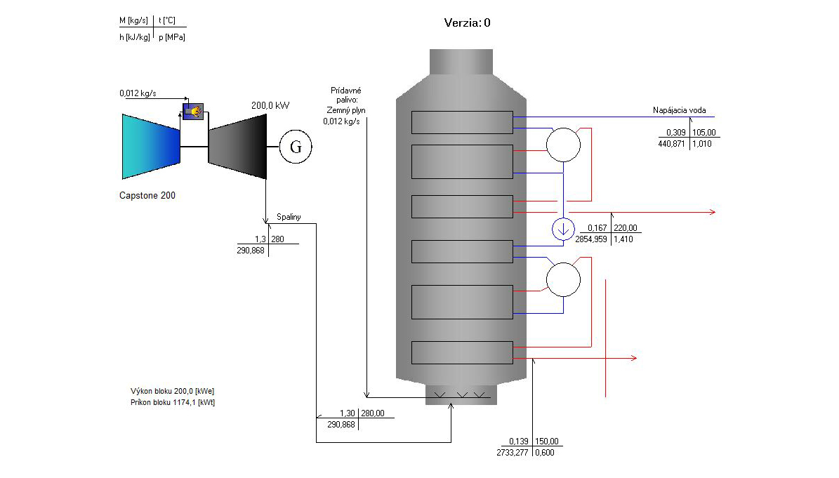 Nový zdroj tepla (mikroturbína a spalinový kotol) (obr. 1) s elektrickým výkonom 200 kWe a tepelnom výkone (spalinový kotol s prikurovaním) 808,6 kWt (čo zodpovedá hodnote base load tepla) s dvoma výstupmi pary 220 °C, 1,41 MPa, množstvo 0,6 t/hod. a 150 °C, 0,6 MPa, množstvo pary 0,5 t/hod. Tretí výstup pary 170 °C, 0,1 MPa množstvo 6 t/hod, bude pripravovaný v samostatnom parnom kotli.