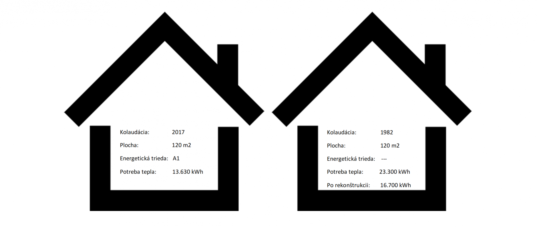 Pre účely porovnania sme počítali s 2 príkladmi s rovnakou obytnou plochou 120 m2. Prvým je novostavba – nízkoenergetický rodinný dom spadajúci do energetickej triedy A1 s priemernou ročnou potrebou tepla na vykurovanie a prípravu teplej vody v objeme 13.630 kWh, s nízkoteplotným podlahovým vykurovaním (teplonosné médium: voda).