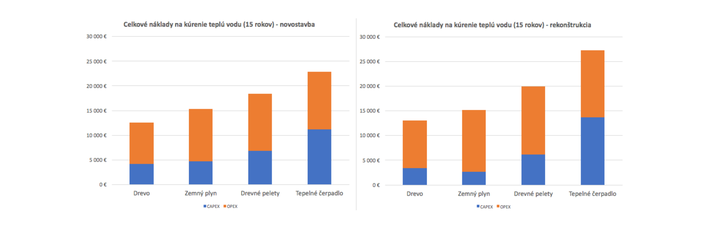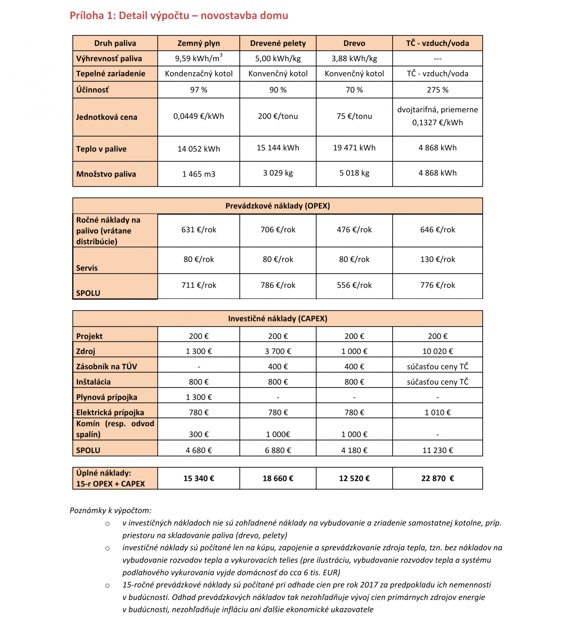 Z pohľadu 15-ročného životného cyklu, ekonomicky najvýhodnejším palivom pre vykurovanie nového rodinného domu a prípravu teplej vody je drevo (1), nasledované zemným plynom (1 + 22,5 %), drevnými peletami (1 + 49,0 %) a elektrickým tepelným čerpadlom vzduch/voda (1 + 82,7 %).