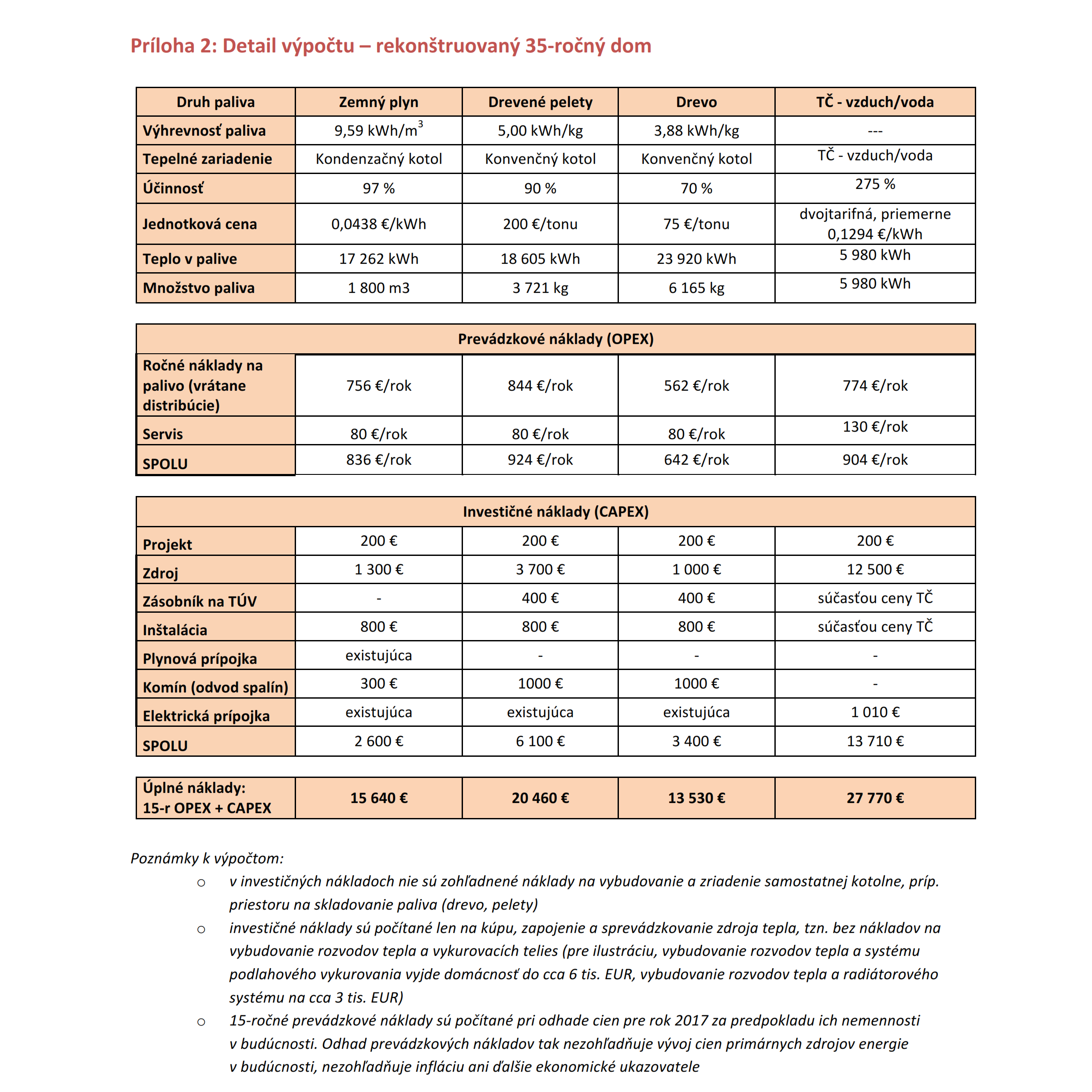 Rovnaké poradenie ekonomickej výhodnosti sme zaznamenali aj v modelovom príklade rekonštruovaného 35-ročného rodinného domu s tým, že pri danej potrebe tepla je prírastok celkových nákladov v 15-ročnom životnom cykle medzi drevom a zemným plynom priaznivejší, konkrétne 1 + 15,6 %. Prírastky nákladov na ostatné palivá sú v porovnaní s novostavbou menej priaznivé, konkrétne pre drevné pelety 1 + 51,2 % a tepelné čerpadlo 1 + 105,2 %.