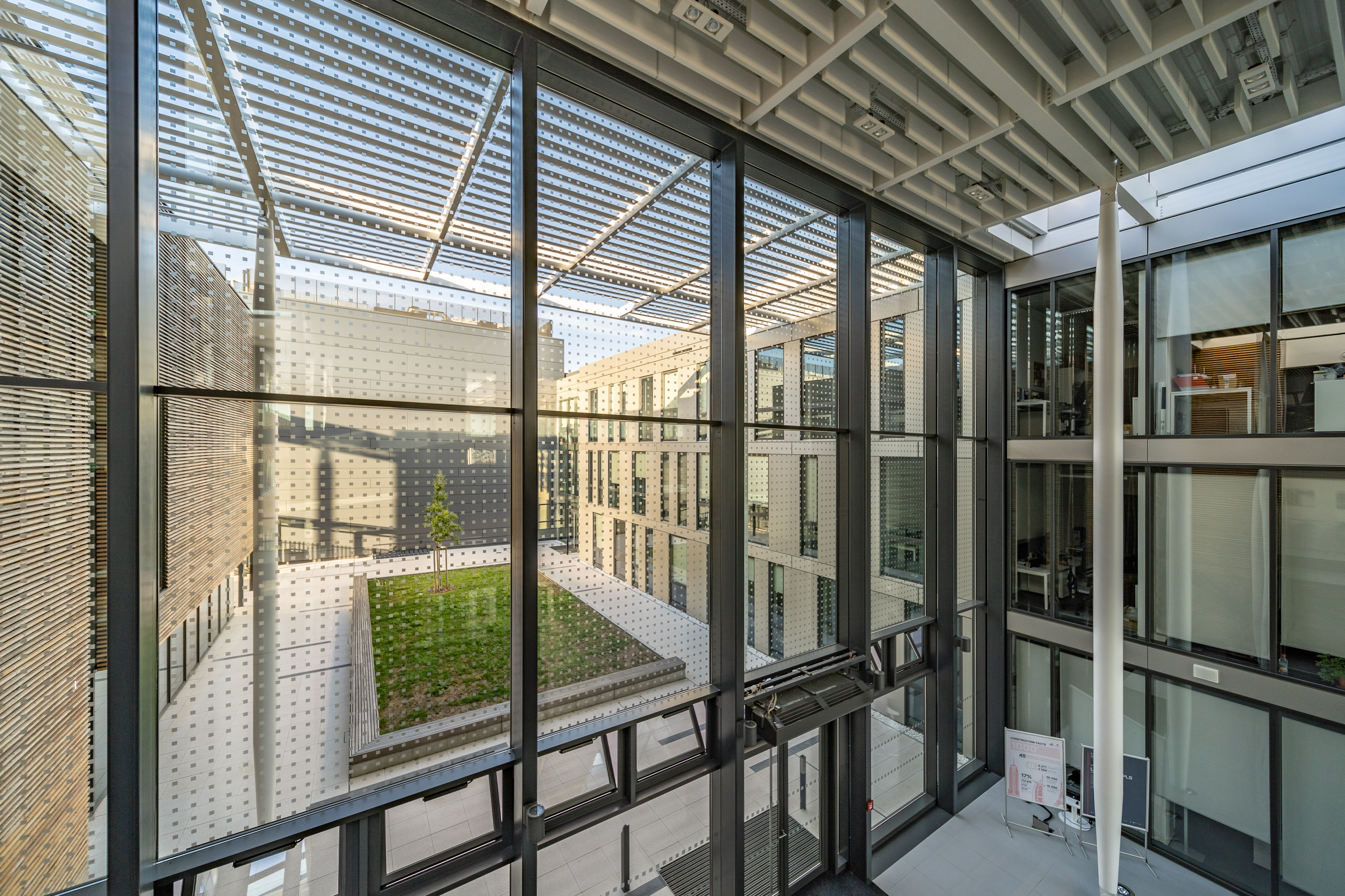 Vplyv na pracovné prostredie vedcov má aj použité zasklenie od Guardian Glass. Na stavbu ELI Beamlines použili architekti moderné protislnečné sklo Guardian SunGuard SuperNeutral 70/37. Estetické a funkčné sklo privádza do interiéru dostatok svetla a zároveň odráža väčšinu tepla späť do exteriéru, čím zabraňuje prehriatiu budovy. "Hlavnou výhodou skiel Guardian použitých pri ELI Beamlines je, že do interiéru prepúšťajú približne 37 percent slnečného tepla, ale zároveň veľké množstvo svetla, pretože majú minimálne zafarbenie. Presvetlenie interiéru denným svetlom je preto veľmi dobré a prispieva k príjemnému pracovnému prostrediu v budove," hovorí Michal Hronský zo spoločnosti Guardian. Voľba stavebných materiálov, špeciálne v prostredí obce so 4000 obyvateľmi, dokázala futuristické výskumné centrum citlivo včleniť do okolitej zástavby.