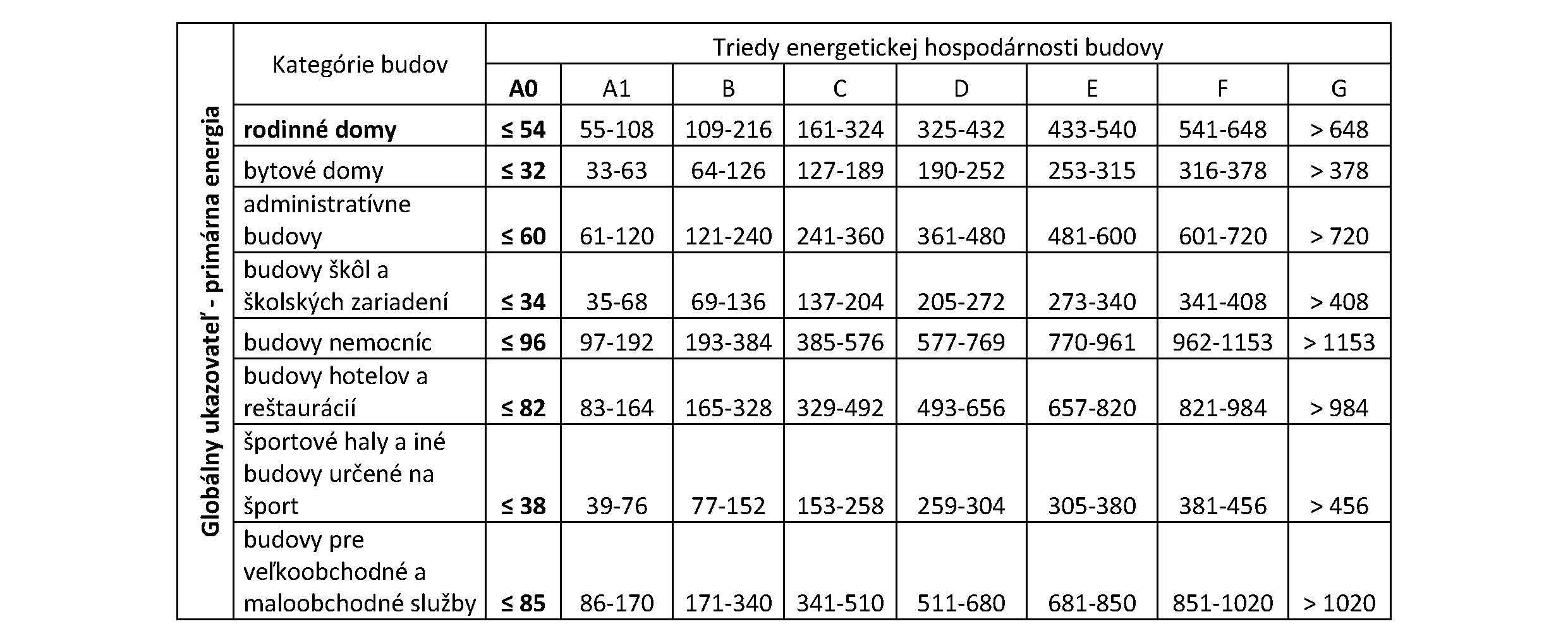 Minimálnou požiadavkou na energetickú hospodárnosť nových budov postavených po 31. decembri 2015 je horná hranica energetickej triedy A1 pre globálny ukazovateľ. Významne obnovovaná budova musí túto požiadavku splniť, ak je to technicky, funkčne a ekonomicky uskutočniteľné. Pre nové budovy vo vlastníctve orgánov verejnej správy postavené po 31. decembri 2018 a pre všetky ostatné nové budovy postavené po 31. decembri 2020 je minimálnou požiadavkou pre globálny ukazovateľ horná hranica energetickej triedy A0. Škála energetických tried globálneho ukazovateľa (primárna energia) podľa vyhlášky č. 364/2012 Z. z. je uvedená v tab. 1.
