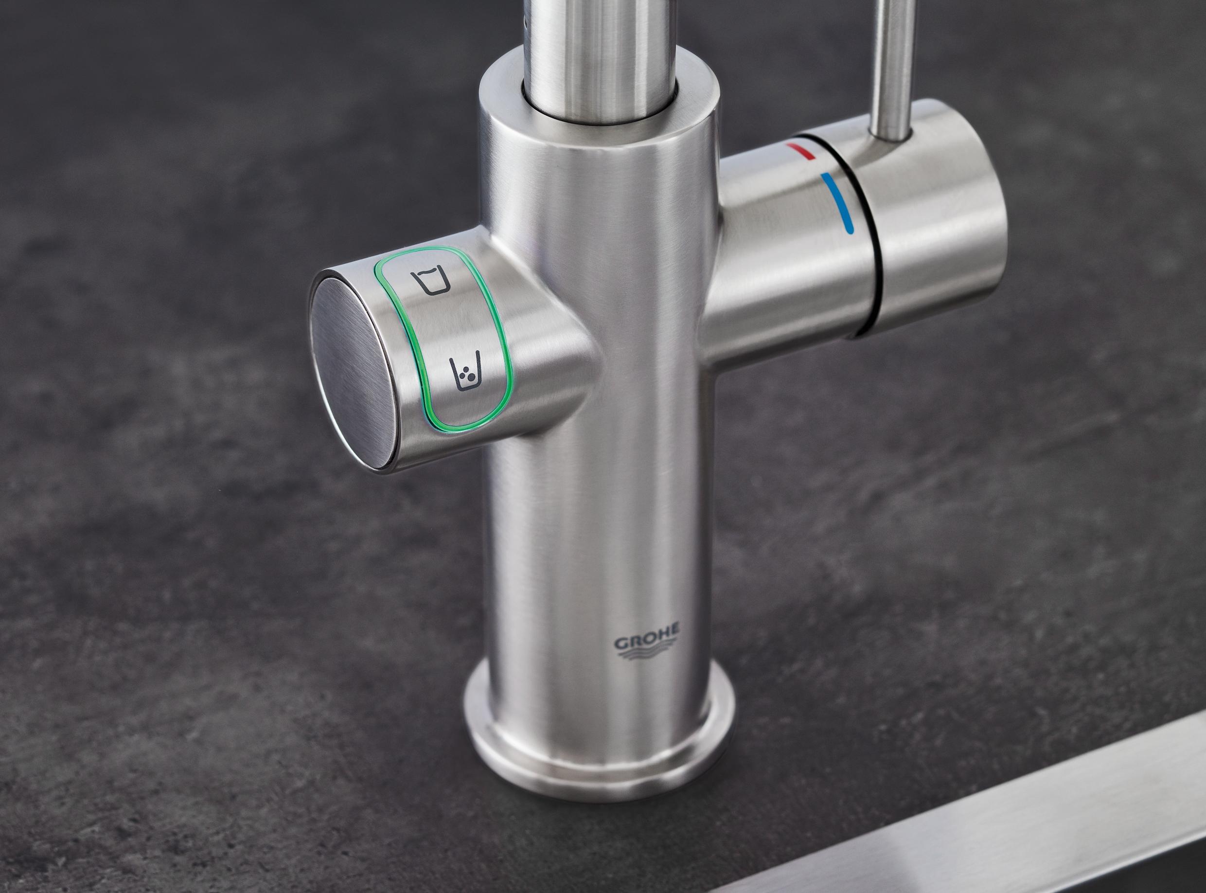 Vodovodné batérie systému GROHE Blue® Home sa stanú stredobodom pozornosti každej kuchyne. Sú elegantne štíhle, disponujú intuitívnym ovládaním dotykom a sú k dispozícii v chrómovej farbe alebo povrchovej úprave supersteel. Môžete si tiež vybrať z troch rôzne vysokých výpustí. Okrem verzie Duo, ktorá obsahuje separované rozvody pre filtrovanú a nefiltrovanú vodu, ponúka spoločnosť GROHE tiež verziu Mono určenú pre inštaláciu vedľa už existujúcej, štandardnej vodovodnej batérie.