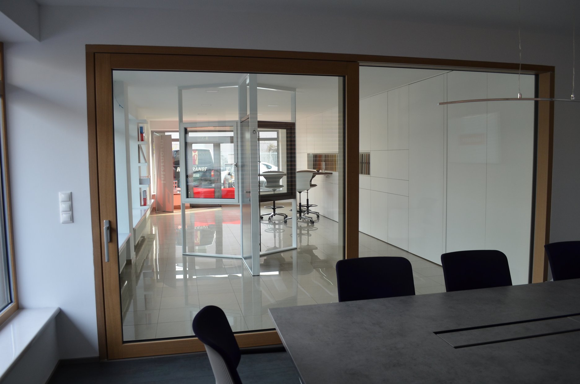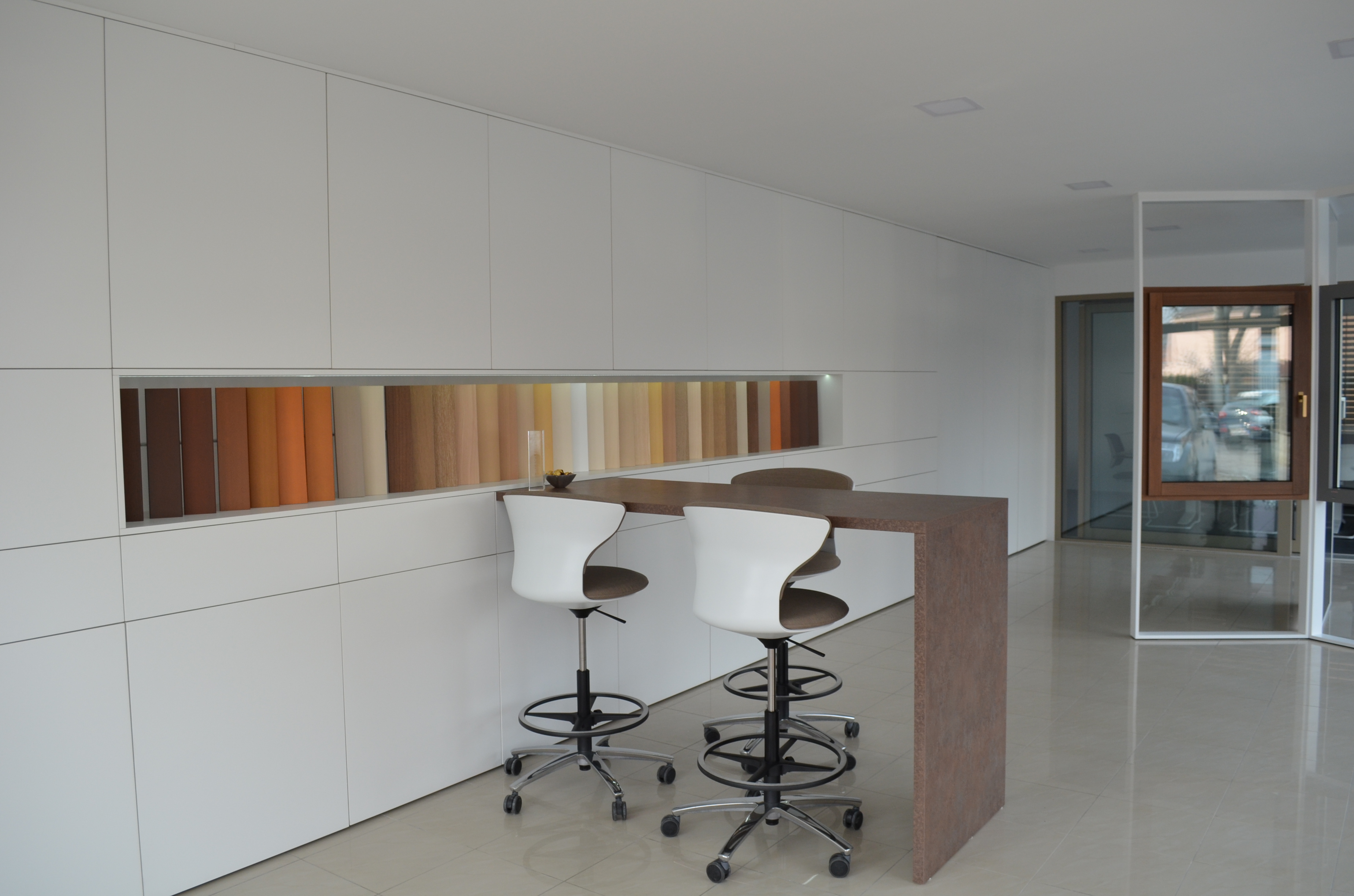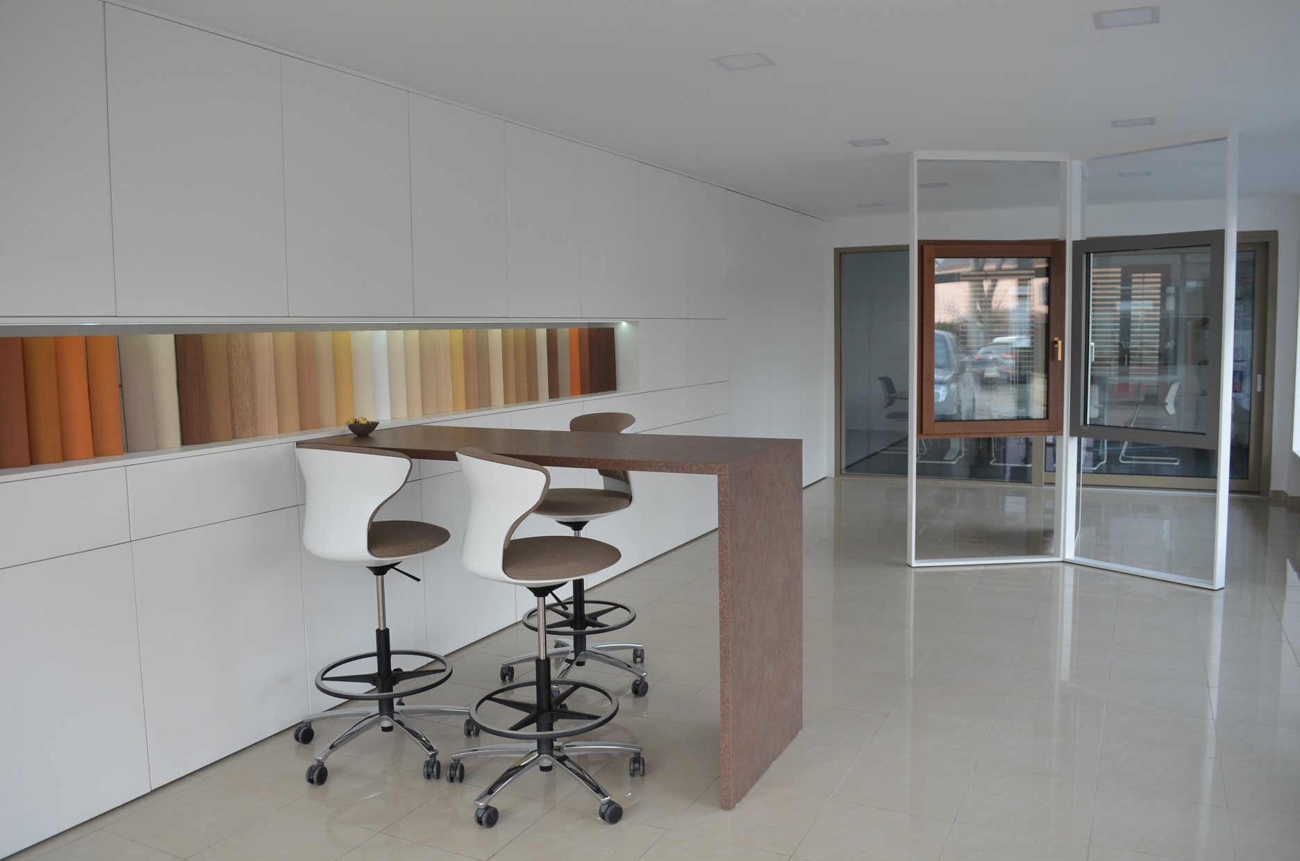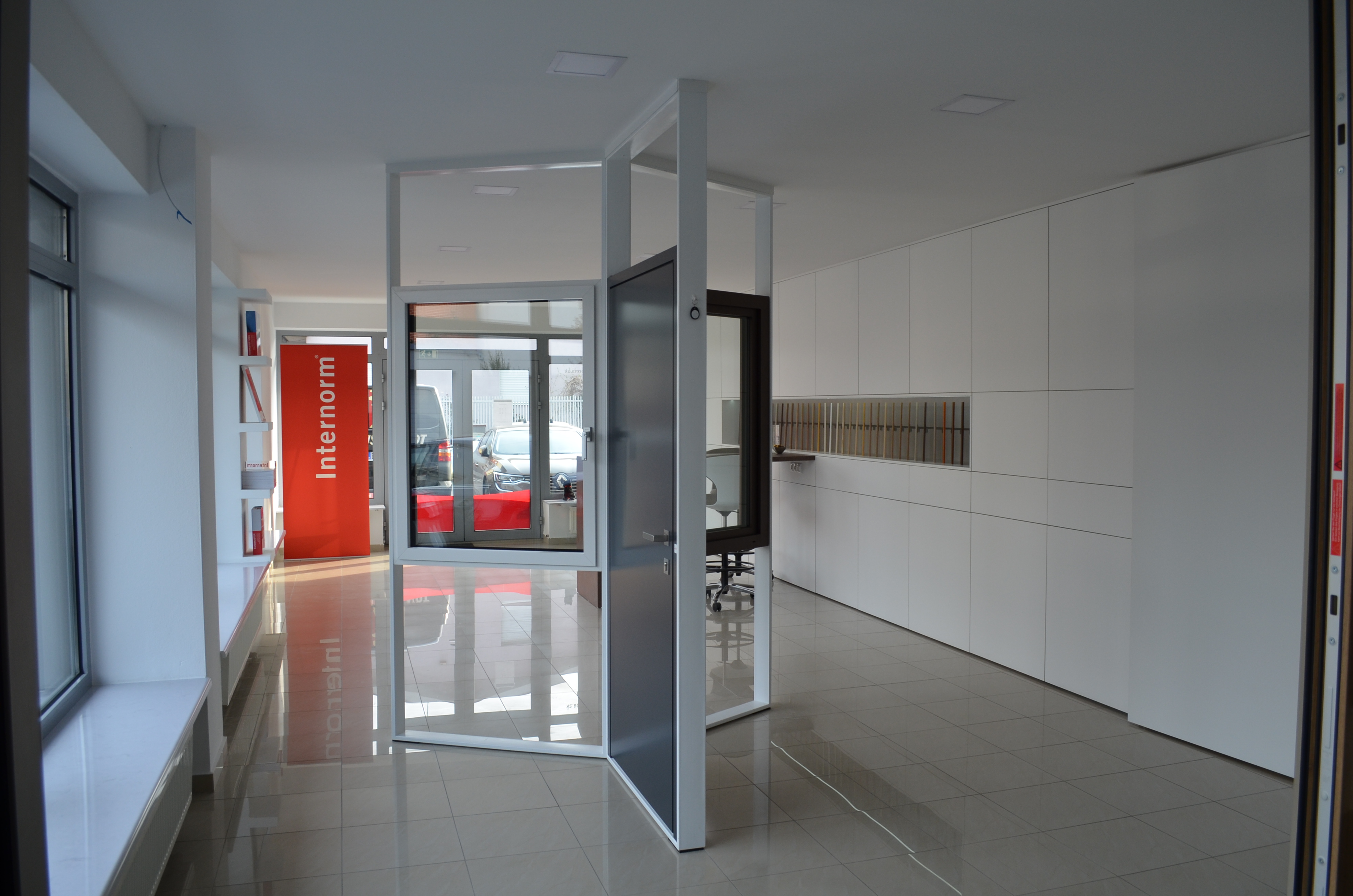 Internorm produkty, drevo-hliníkové okno HX 300 - Panorama a zdvižno-posuvné dvere HS 330 z drevo-hliníka, sú priamo zabudované do showroom-u. Tieto aktuálne trendové výrobky si zákazníci môžu nielen prezrieť priamo v zabudovanom stave, ale dodávajú vzorkovni atraktívny dizajn. Dominantou vzorkovne sú vystavené tri prémiové Internorm produkty – drevo-hliníkové okno HF 410, najbezpečnejšie plast-hliníkové okno KF 500 s I-tec Vetraním ( rekuperácia zabudovaná v okne) a hliníkové vchodové dvere AT 410 s panelom v imitácii hrdze. Predajňa pôsobí veľmi moderne a štýlovo vďaka bielemu interiéru s vystavenými vzorkami dreva, ktorý ukrýva ďalšie produkty.
