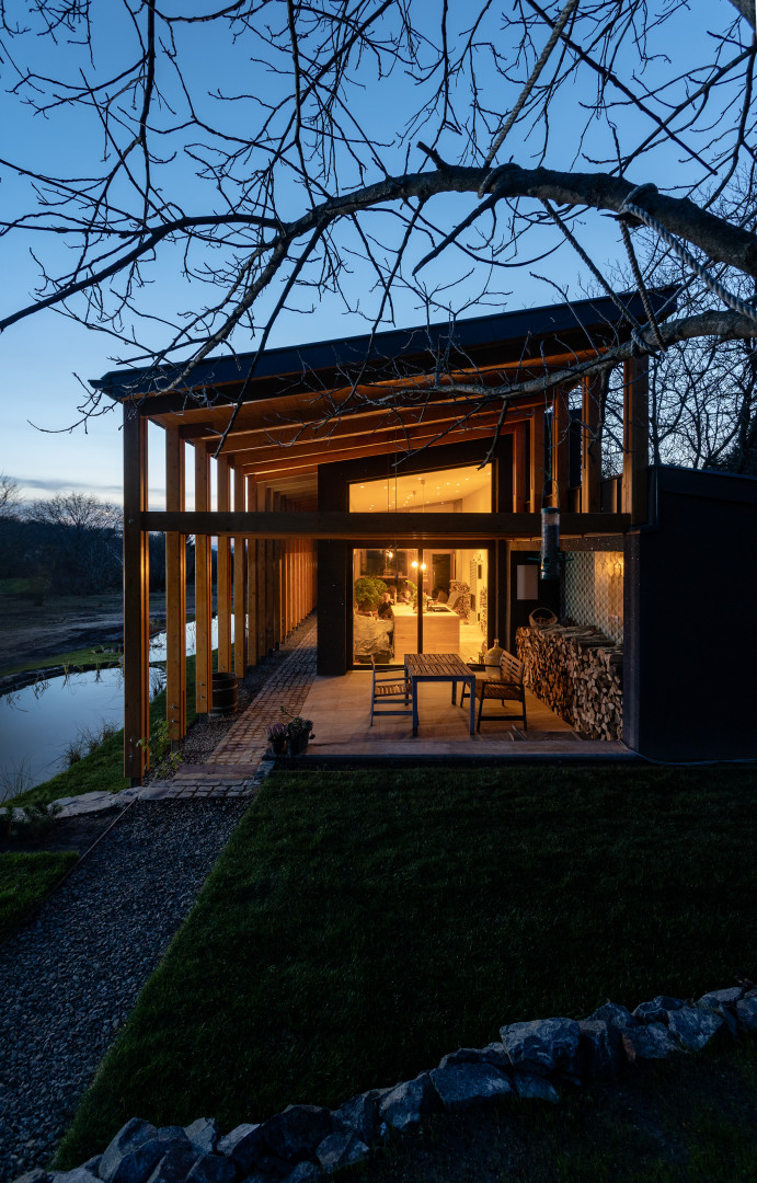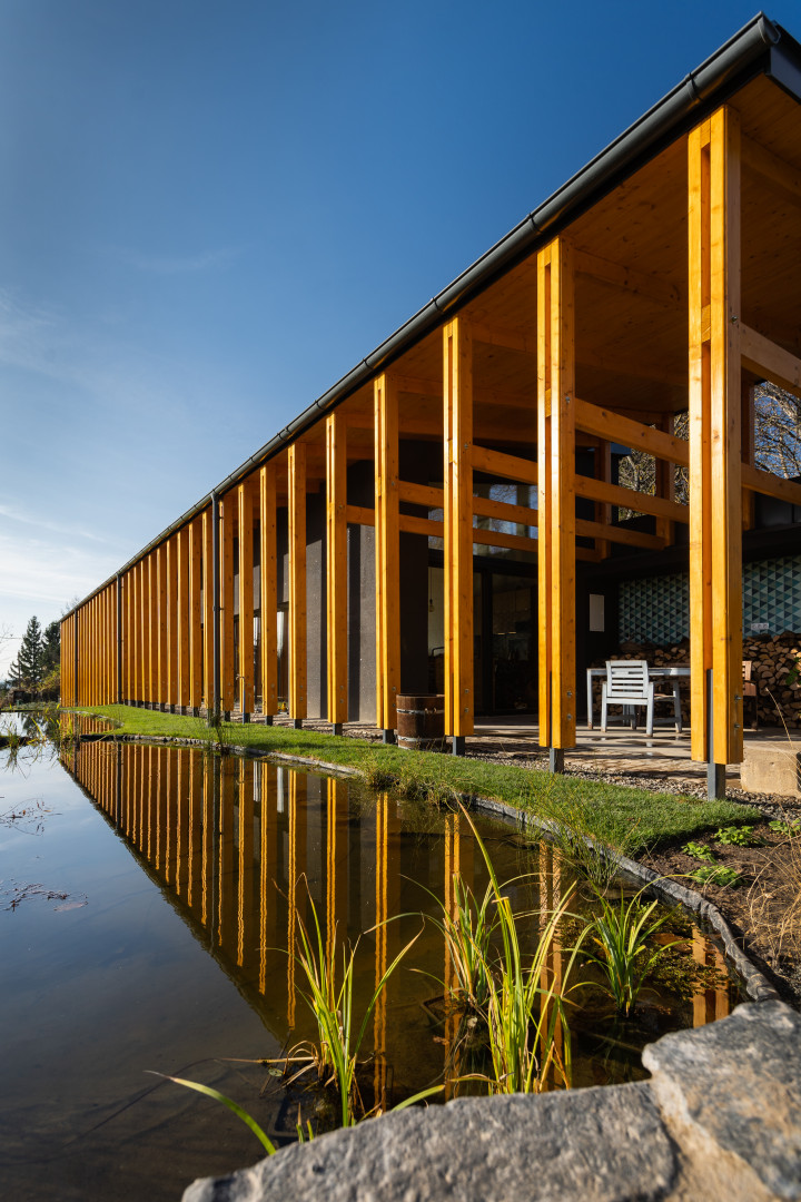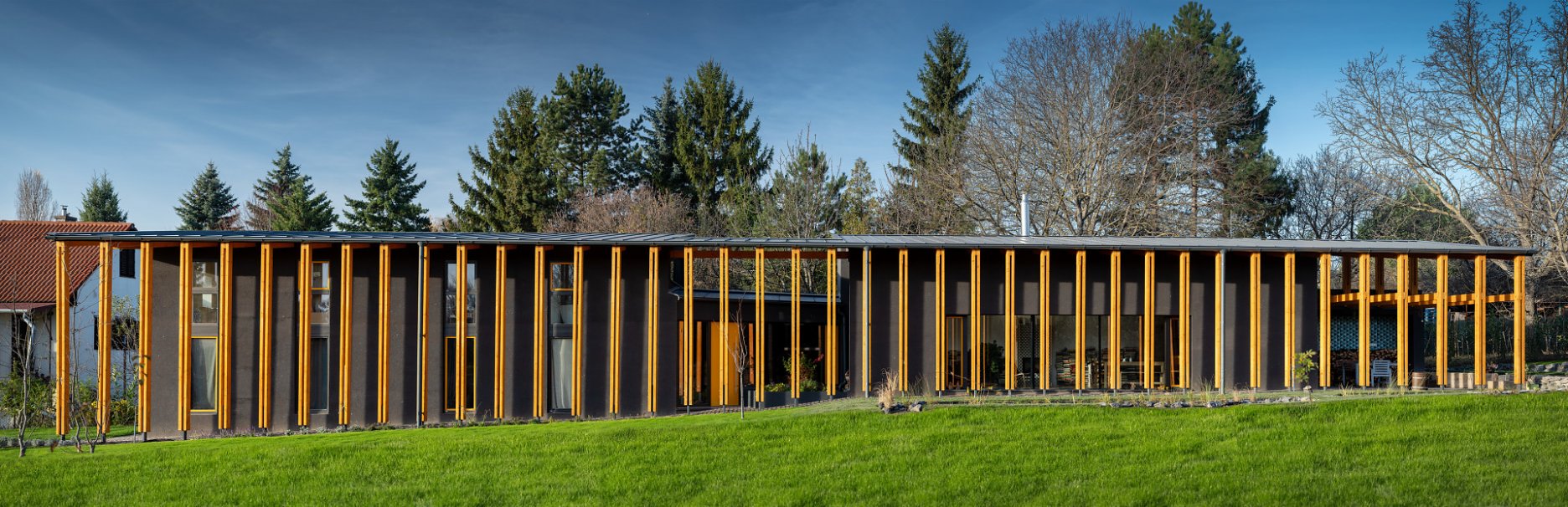 "Všetky zóny domu sú usporiadané pozdĺž centrálnej osi. Rytmický raster drevenej konštrukcie ukrýva fasády s antracitovou omietkou Baumit Top, ktoré sa rozsiahlym presklením otvárajú do záhrady."