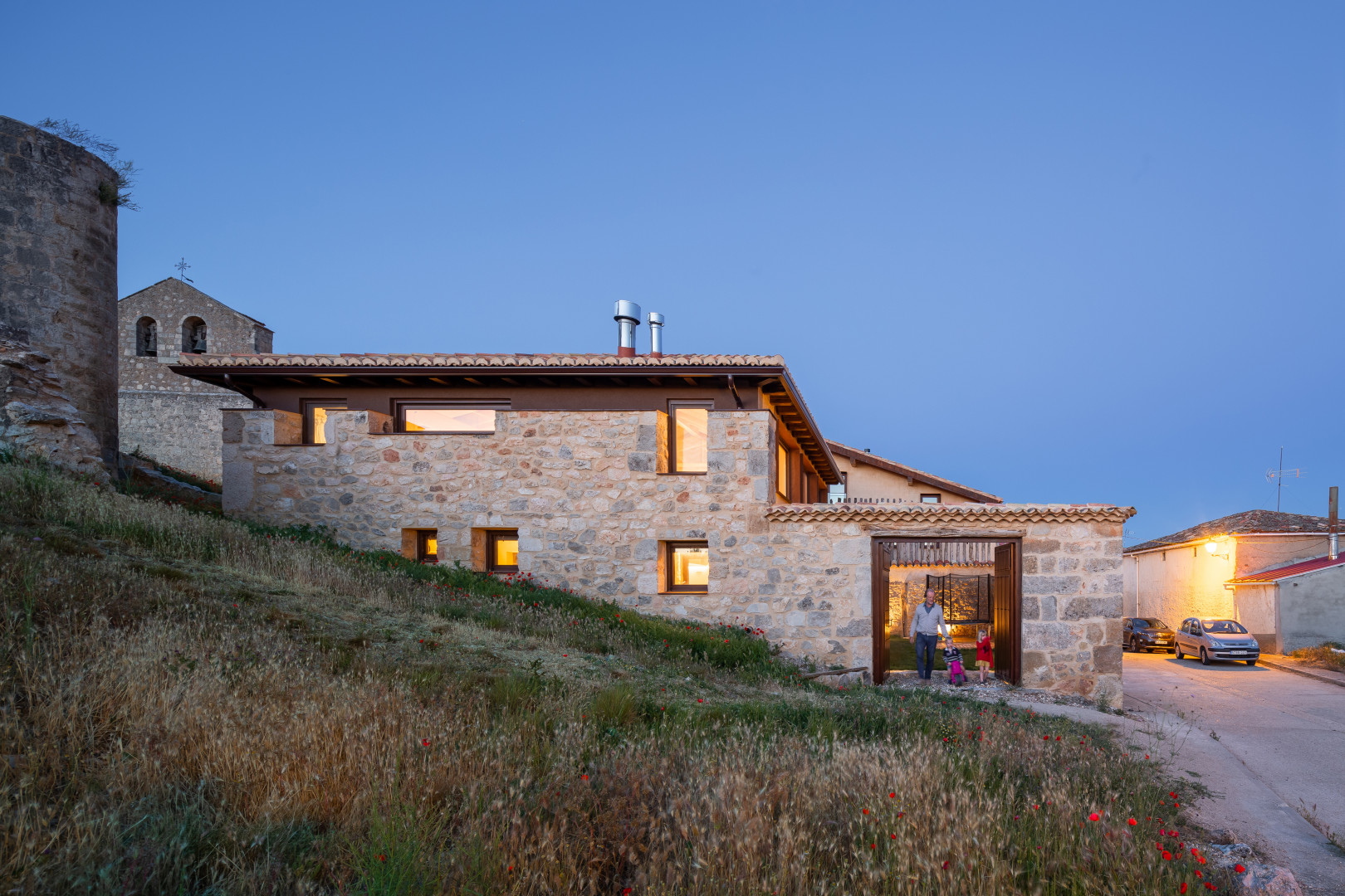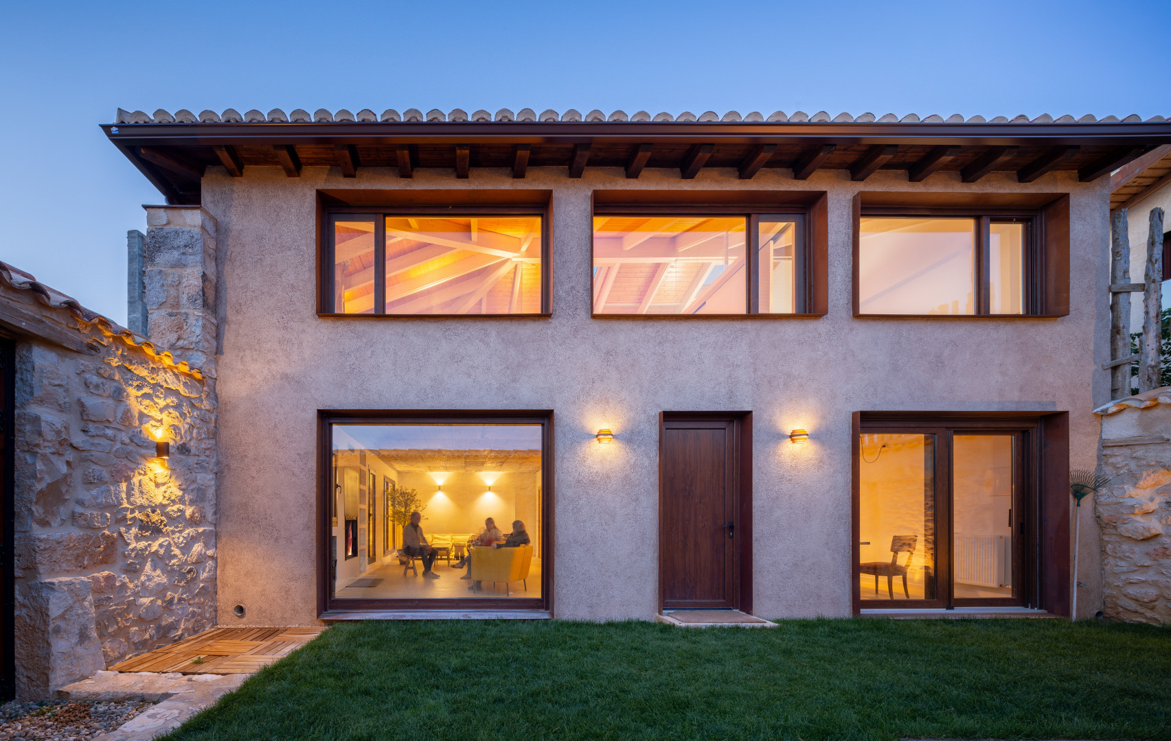 "Obytné prostredie vstavané do kulisy kamenných múrov schátraného domu. Hrubá štruktúra nových povrchov nadväzuje na historický kontext, v interiéri dominuje odhalená trámová konštrukcia "