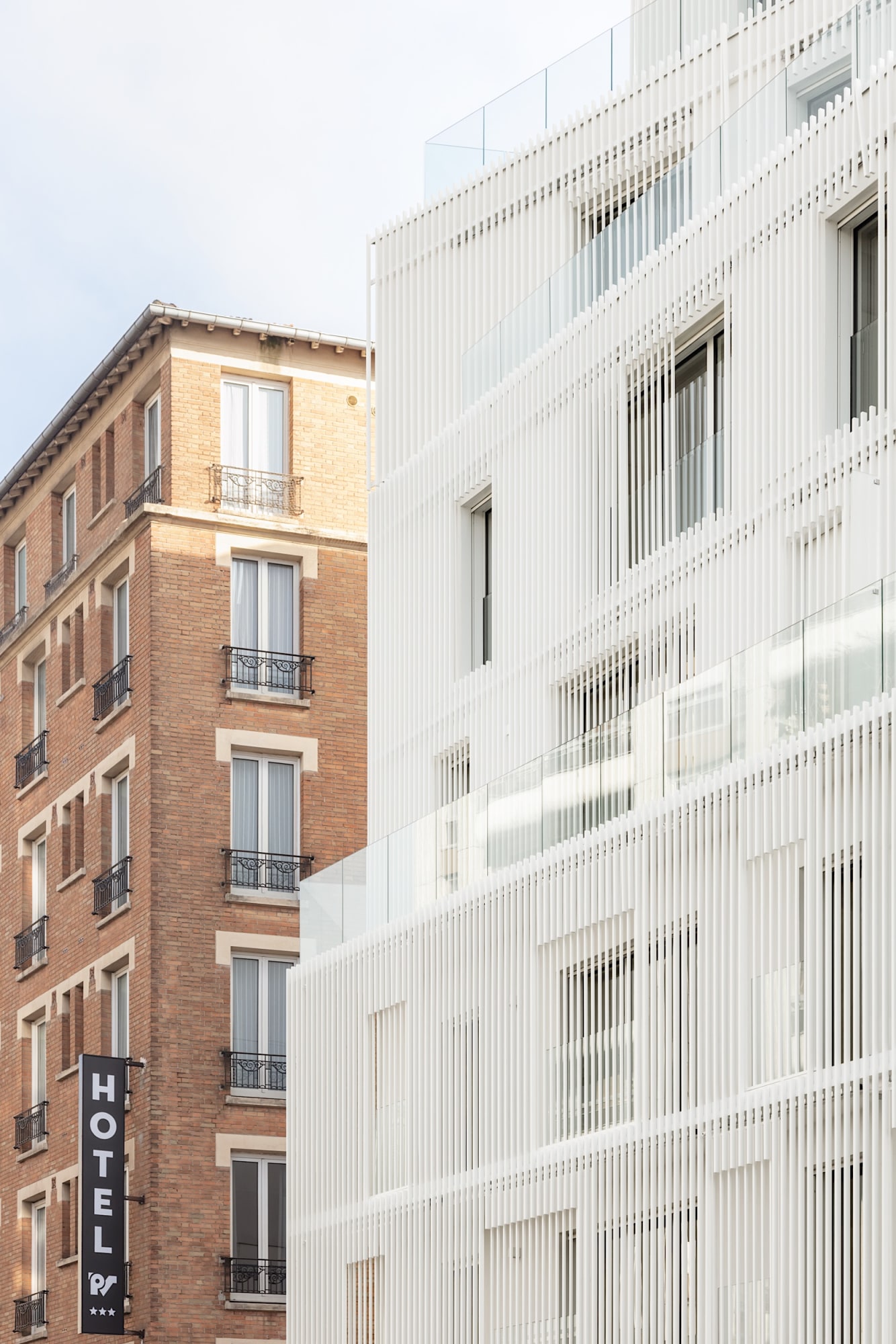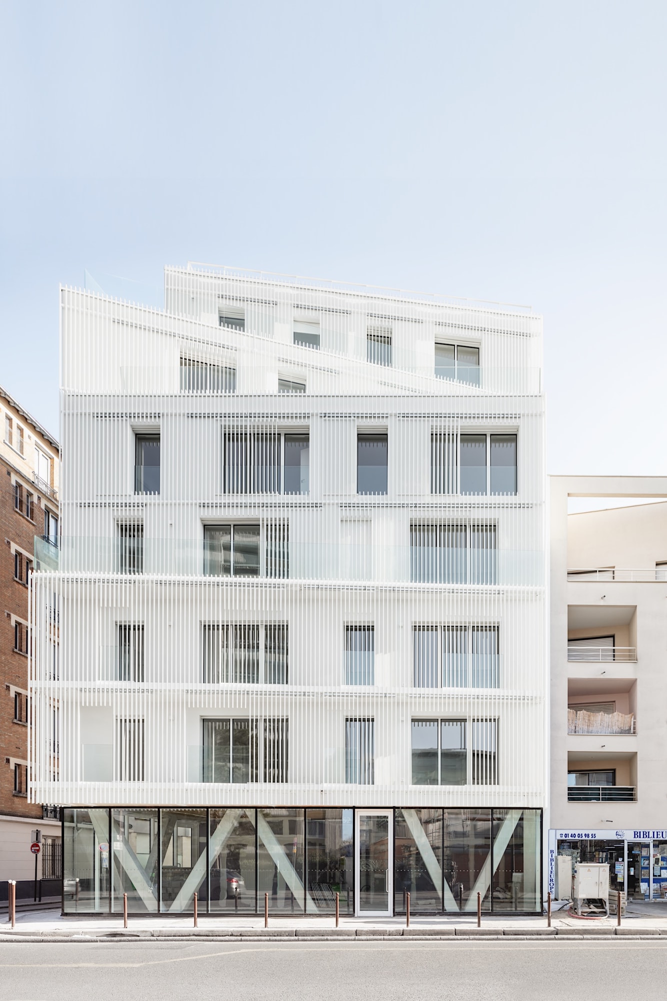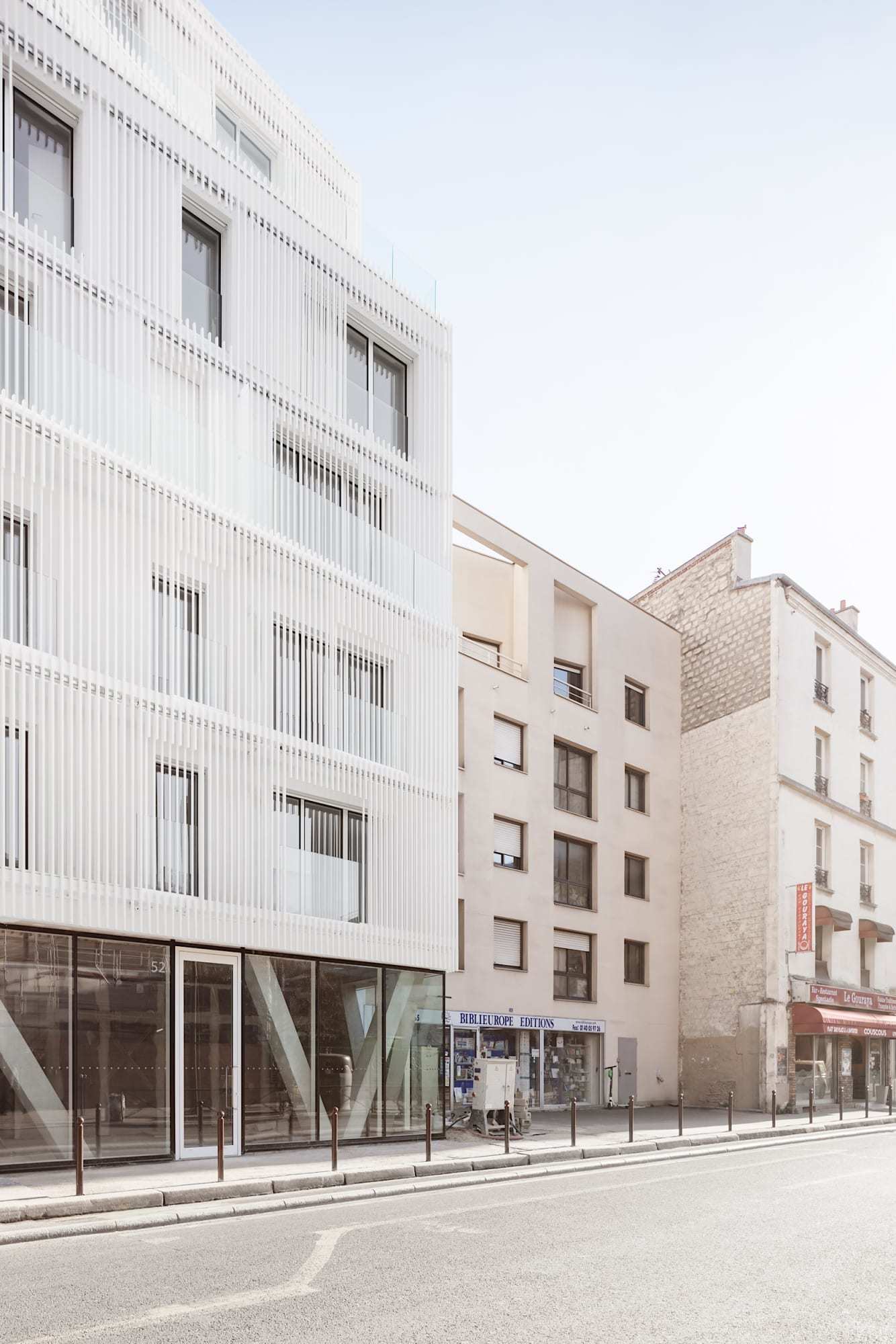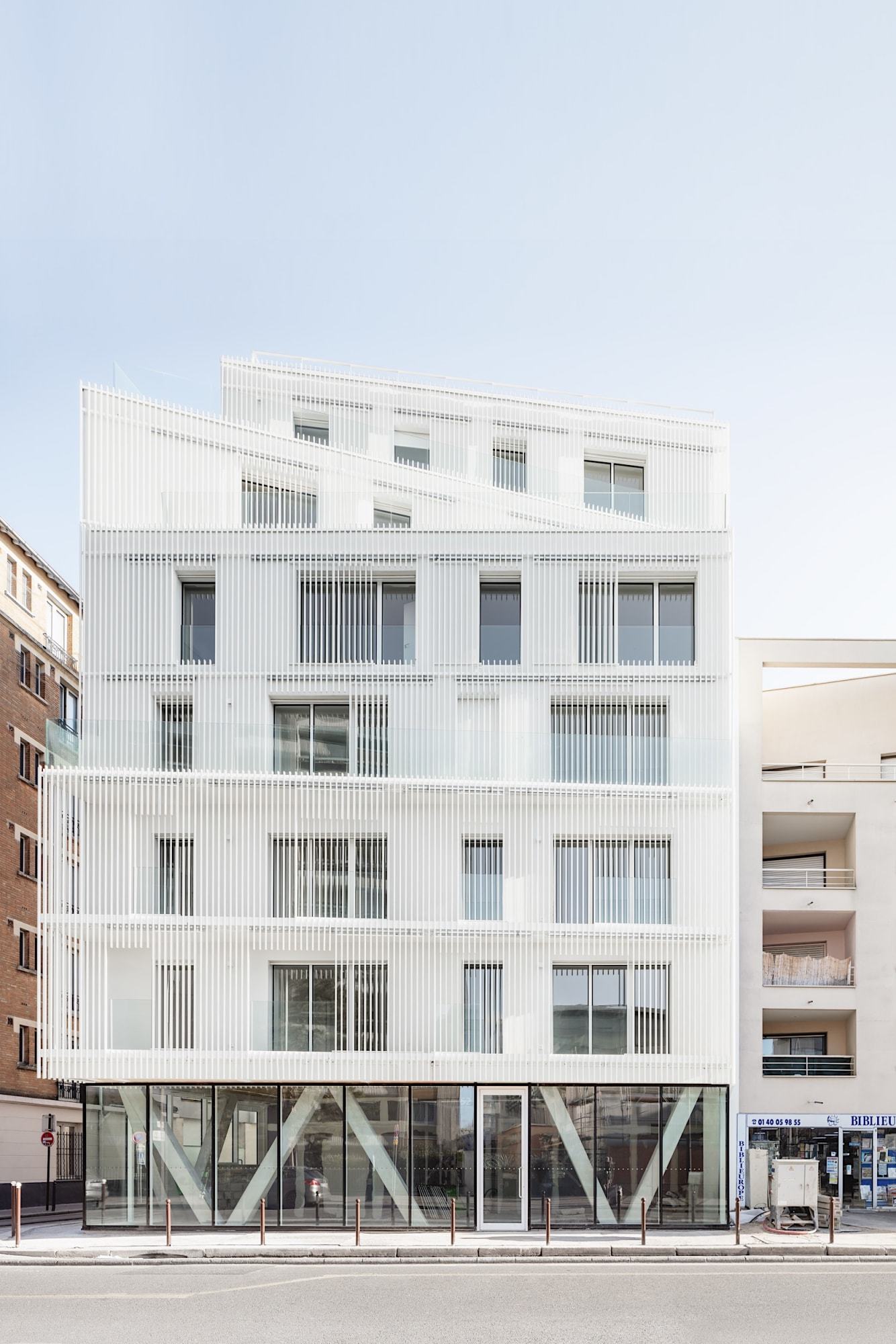 "Mestský dom so 17 sociálnymi bytovými jednotkami a obchodnými priestormi v transparentnom parteri. Predsadený raster vertikálnych lamiel zjednocuje fasádu a vytvára súkromie pre priestranné lodžie strešné terasy"