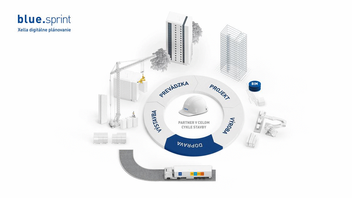 V projektovej fáze z akýchkoľvek digitálnych podkladov (PDF, DWG, IFC) vám v Xelle spracujú BIM model muriva, digitálne „dvojča“ stavby. Ak projektujete v BIM, môžete využiť BIM knižnicu s produktmi celého Xella sortimentu. V rámci služby blue.sprint môžete využiť napríklad kontrolu kolízie v nadväznosti stien, návrh optimalizácie riešenia projektu vrátane cenovej ponuky a výkazu materiálu. Po stránke výroby je možné získať plány kladenia a montáže stien z veľkoformátových výrobkov na základe odsúhlaseného 3D modelu a vyrobia vám tiež stenové panely na mieru. Všetky dodávané prvky nájdete prehľadne vo výkaze zhrnuté po stenách, podlažiach aj za celý objekt. Dôležitá je tiež optimalizácia dodávok materiálu – ten je vďaka blue.sprint dodávaný na čas podľa harmonogramu. Plán dodania sa prispôsobí vášmu typu dopravy a vykládky podľa potrieb stavby a výrobca zaistí aj zvoz paliet. Ak sa v rámci spolupráce s dodávateľom rozhodnete aj pre veľkoformátovú výstavbu a použitie montážnej techniky, ktorú vám zapožičia, ušetríte čas, spotrebovaný materiál a náklady. Preškolí vás personál pre prácu s technikou a po celú dobu projektu máte k dispozícii odborného manažéra. V neposlednom rade je potrebné spomenúť, že Xella ako dodávateľ je optimálny aj z hľadiska ekologického – dlhodobo sa zameriava na zachovanie prírodných zdrojov, zníženie emisií a spotreby energie, čím prispieva k získaniu certifikácií budov v systémoch LEED/BREAM.