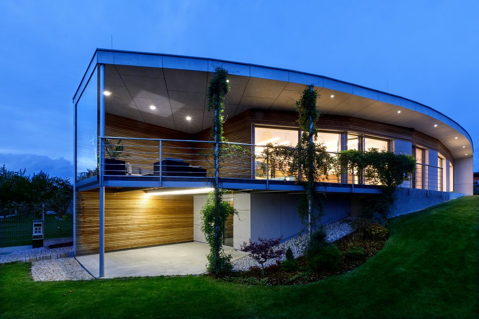Na začiatku obvykle býva prianie postaviť si dom, až potom sa na jeho realizáciu hľadá vhodný pozemok. V jednej rodine zafungoval myšlienkový proces opačne. Keď sa začala predávať parcela na kopci s neopakovateľnými výhľadmi, rozhodli sa, že si na nej postavia dom. Aj keď už jeden mali o niekoľko desiatok metov ďalej. Vysnenými výhľadmi sa dnes kochajú vďaka „zelenému“ tehlovému domu s rozsiahlymi zasklenými plochami. Do oblúka prehnutá krivka celej južnej strany ich vťahuje do okolitej krajiny a poskytuje im výhľady na tri svetové strany.