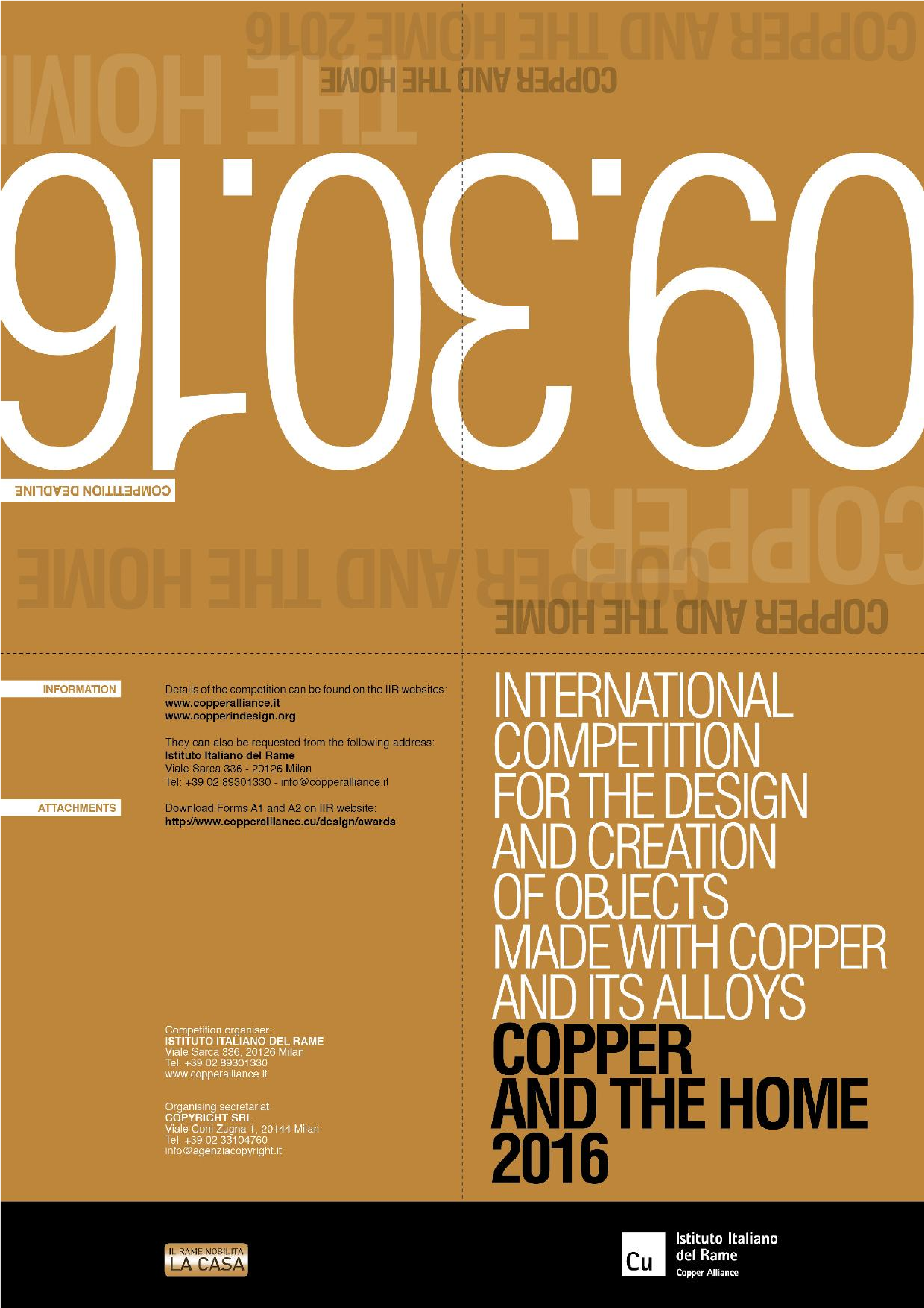 Takže súťaž je opäť pripravená zhromaždiť stovky nových, zvláštnych, nezvyčajných či revolučných myšlienok, od doplnkov osvetlenia, cez vázy, predmety pre stolovanie, stoly, sedačky a interiérové dekorácie, až po interiérové steny, podlahy, radiátory, zábradlia a ďalšie výrobky. Absolútnym protagonistom je meď, a to ako čistá, tak aj jej zliatiny, ako je bronz, mosadz alebo meď, spojená s rôznymi ďalšími materiálmi.