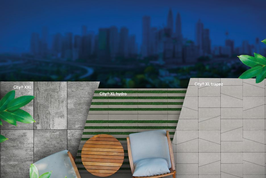 Naozajstnou veľkoformátovou dlažbou je novinka City® XXL v rozmeroch 100 x 50 cm a 100 x 75 cm. Táto dlažba opticky zväčší akýkoľvek priestor, a aj napriek svojim rozmerom pôsobí vkusne a minimalisticky. Je dostupná v jemných odtieňoch sivo-bielej a sivo-grafitovej.