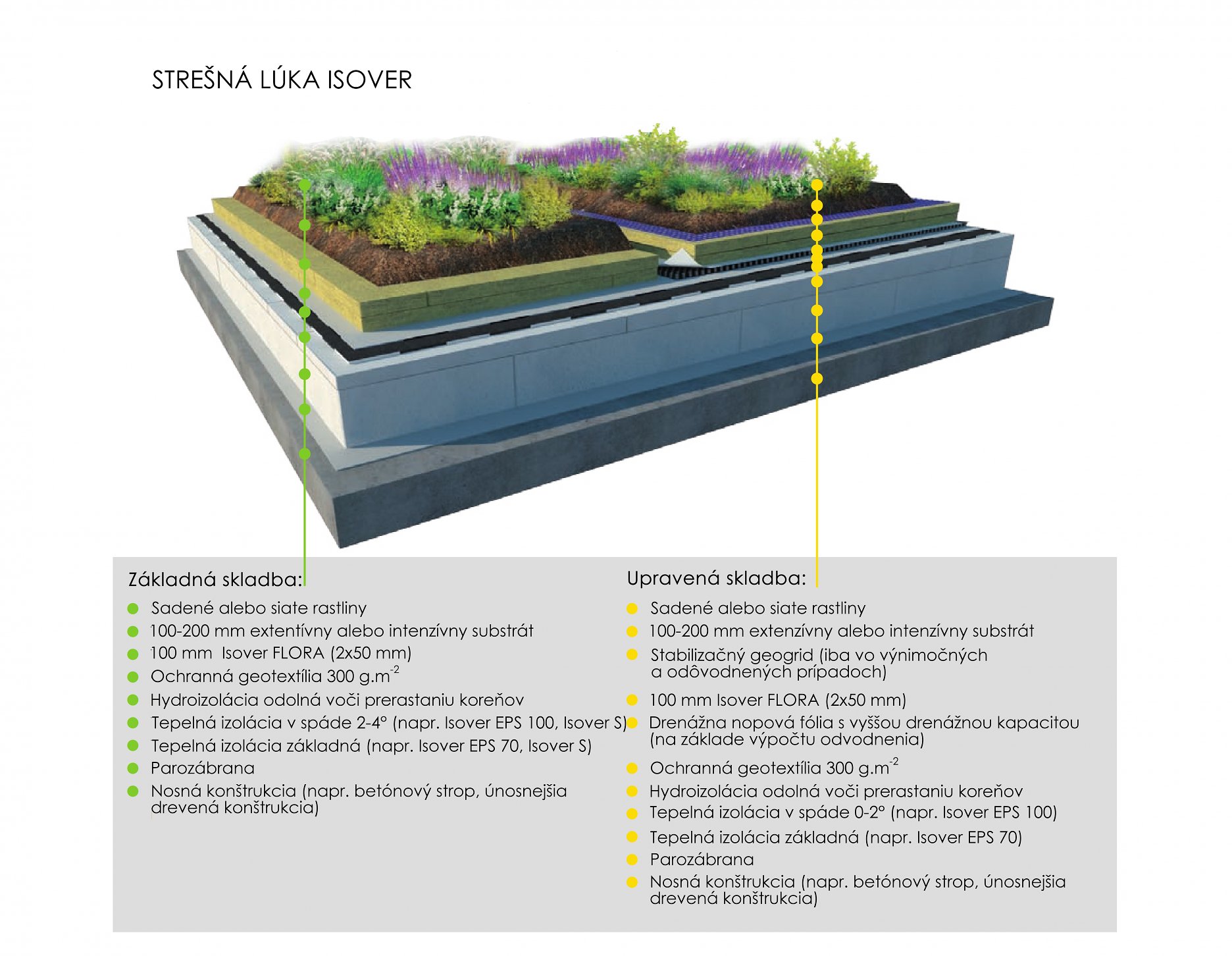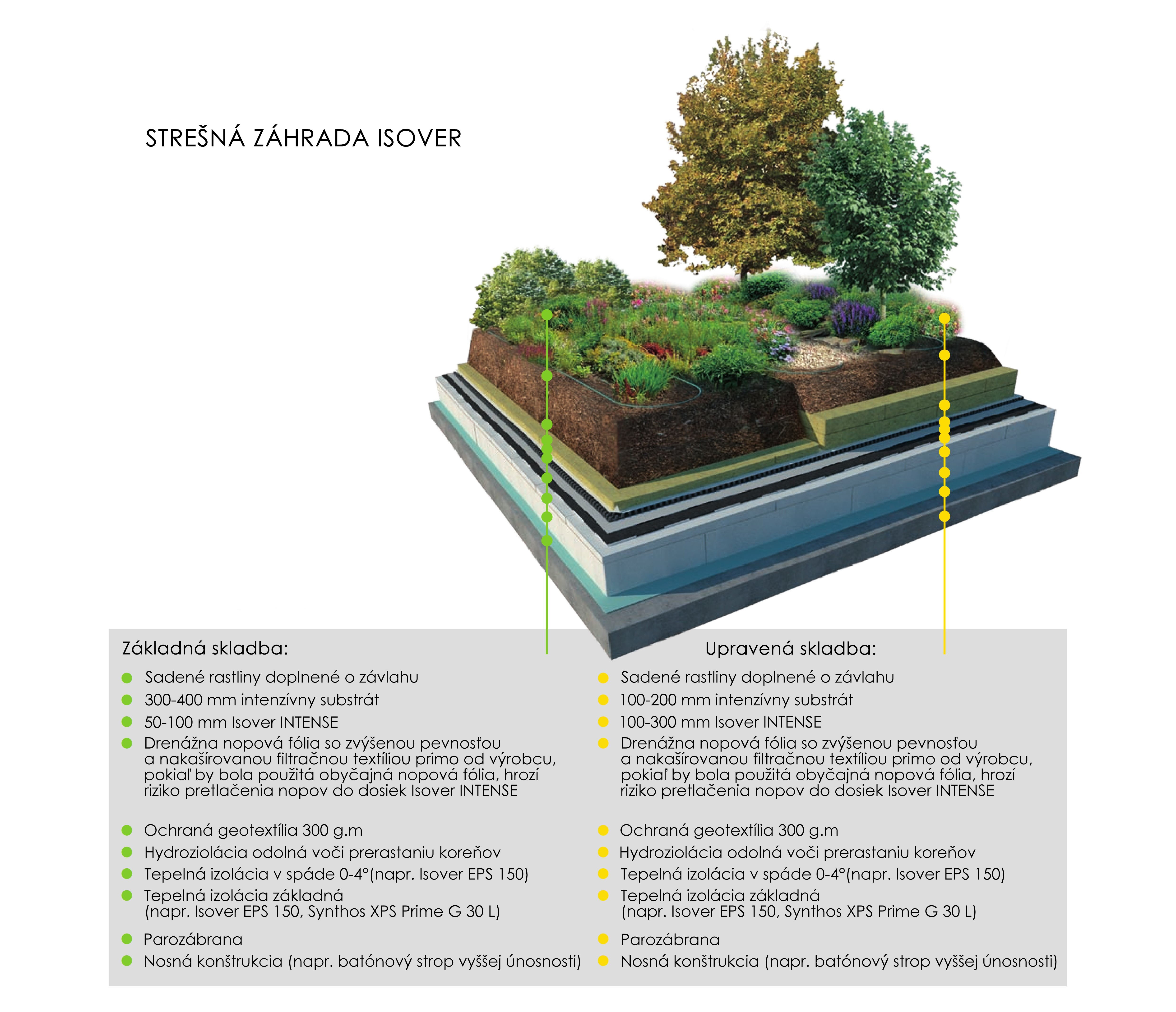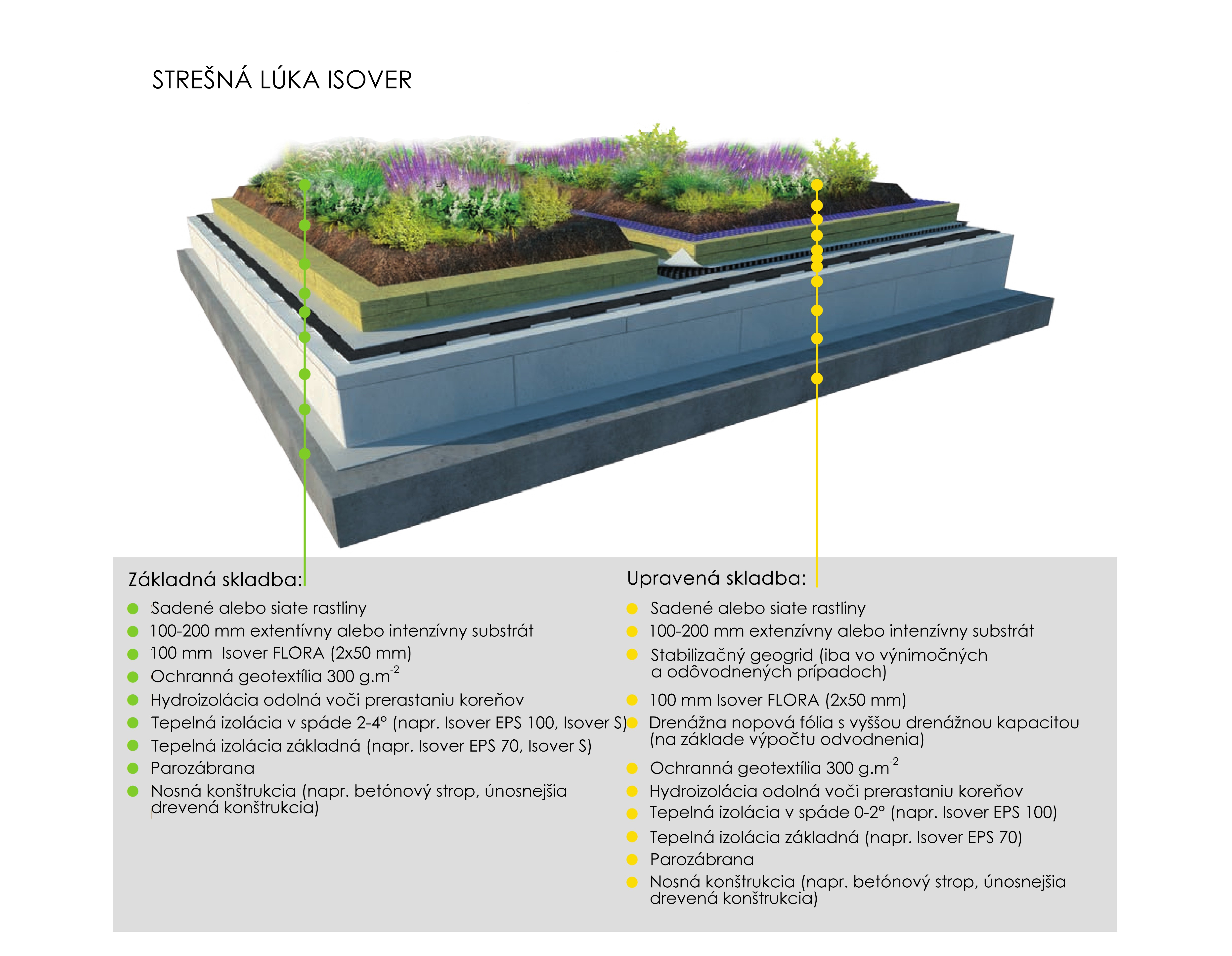 Skladby s polointenzívnou vegetáciou sú stále ešte nenáročné na údržbu, ale umožňujú osádzať aj širšie spektrum rastlín. Najčastejším typom zelene sú práve spoločenstvá bylín a tráv. Hrúbka vegetačnej vrstvy pre zakoreňovanie rastlín sa pohybuje medzi 200-300 mm. Dosky Isover FLORA by mali tvoriť približne polovicu tejto výšky. Zasypávajú sa vrstvou substrátu vo výške minimálne 100 mm, podľa náročnosti rastlín a architektonického riešenia. V prípade veľmi malého sklonu strechy (0-2°) je odporúčané použiť drenážnu fóliu ako ochranu proti premokreniu. Táto skladba je po overení statickej únosnosti vhodná aj pre rekonštrukcie.