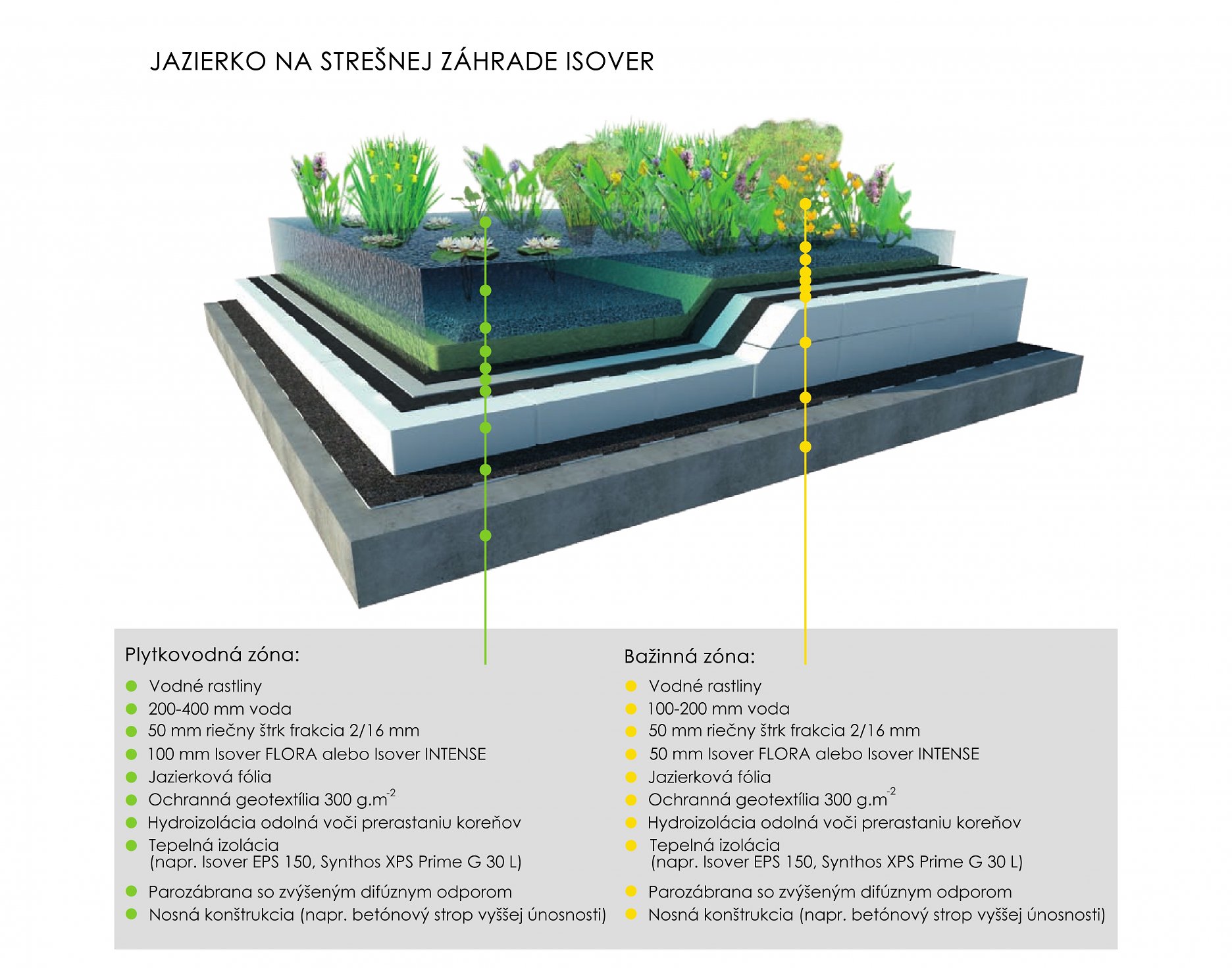 Strešné jazierko nemusí byť zase tak náročné a nákladné, ako by sa na prvý pohľad mohlo zdať. Jeho hmotnosť bude rovnaká, alebo dokonca nižšia ako u strešnej záhrady. Nebudú tu žiadne veľké ťažké stromy alebo košaté kríky, ale iba vodné rastliny, ktoré zakorenia aj v malom množstve vodného substrátu. Hydrofilná minerálna vlna je ideálnym materiálom práve pre tieto konštrukcie.