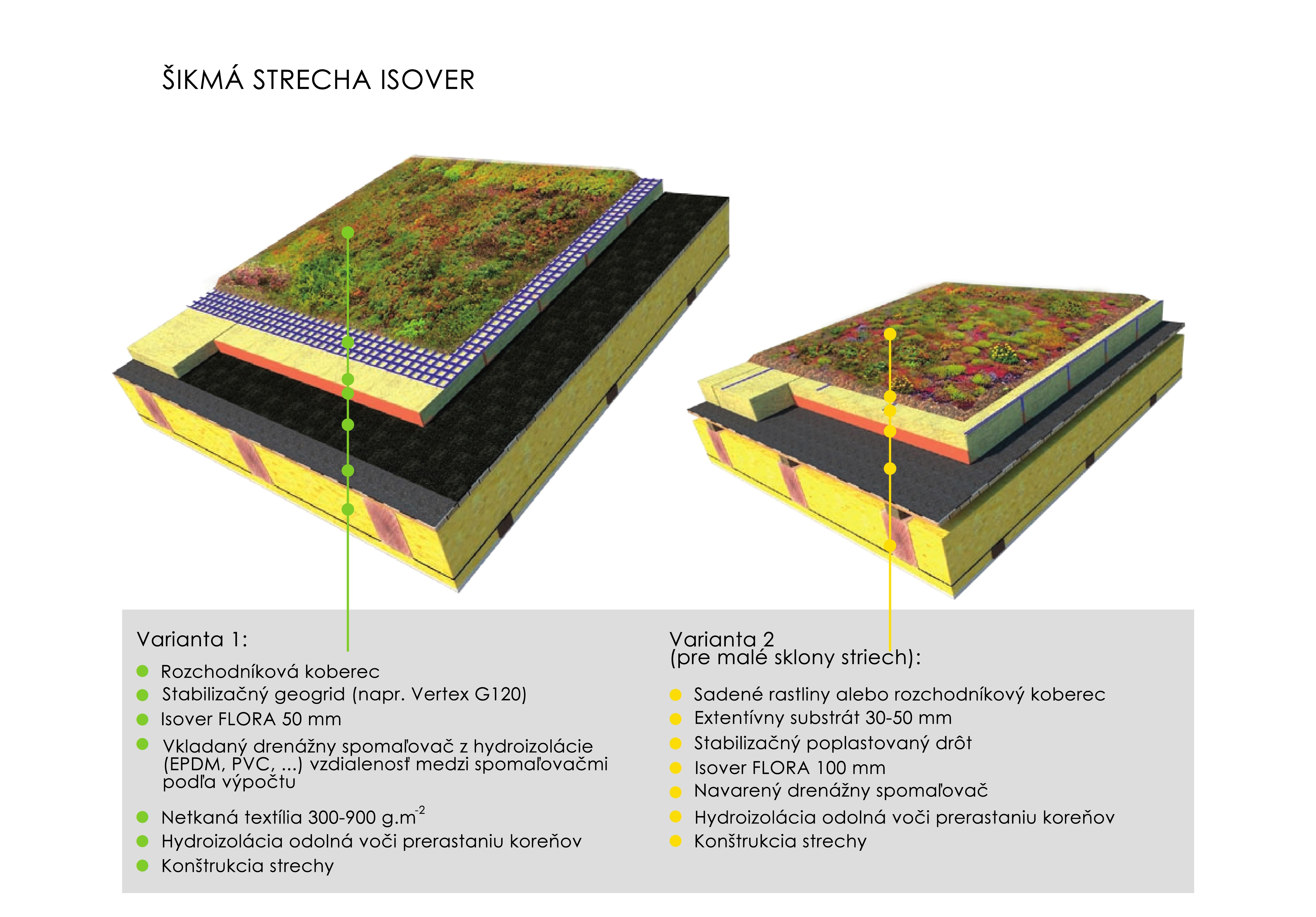 je vhodný pre väčšinu šikmých vegetačných striech (aj pre veľmi strmé strechy). Pri použití hydrofilnej minerálnej vlny v šikmých strechách je nevyhnutné použiť drenážne spomaľovače, pretože inak by voda zo strechy odtekala veľmi rýchlo a horná časť strechy by bola suchá a rastliny by tu uhynuli. Drenážny spomaľovač je v tomto prípade tvorený pásom hydroizolácie, ktorý sa vkladá medzi dve dosky hydrofilnej vlny. Veľmi záleží na sklone strechy a na tom, koľko vody je potrebné v streche zadržať. Spomaľovače môžu byť vo veľmi strmých strechách dokonca umiestnené vo vzdialenosti 15 cm od seba a bude tu nutné miesto dosiek Isover FLORA použiť dosky Isover INTENSE, ktoré majú silnejšiu hydroakumuláciu. Podrobnosti budú uvedené v kapitole Projekt - 3. časť seriálu, rovnako ako kotvenie geogridu a dimenzovanie odvodňovacieho prvku pod spomaľovačmi.