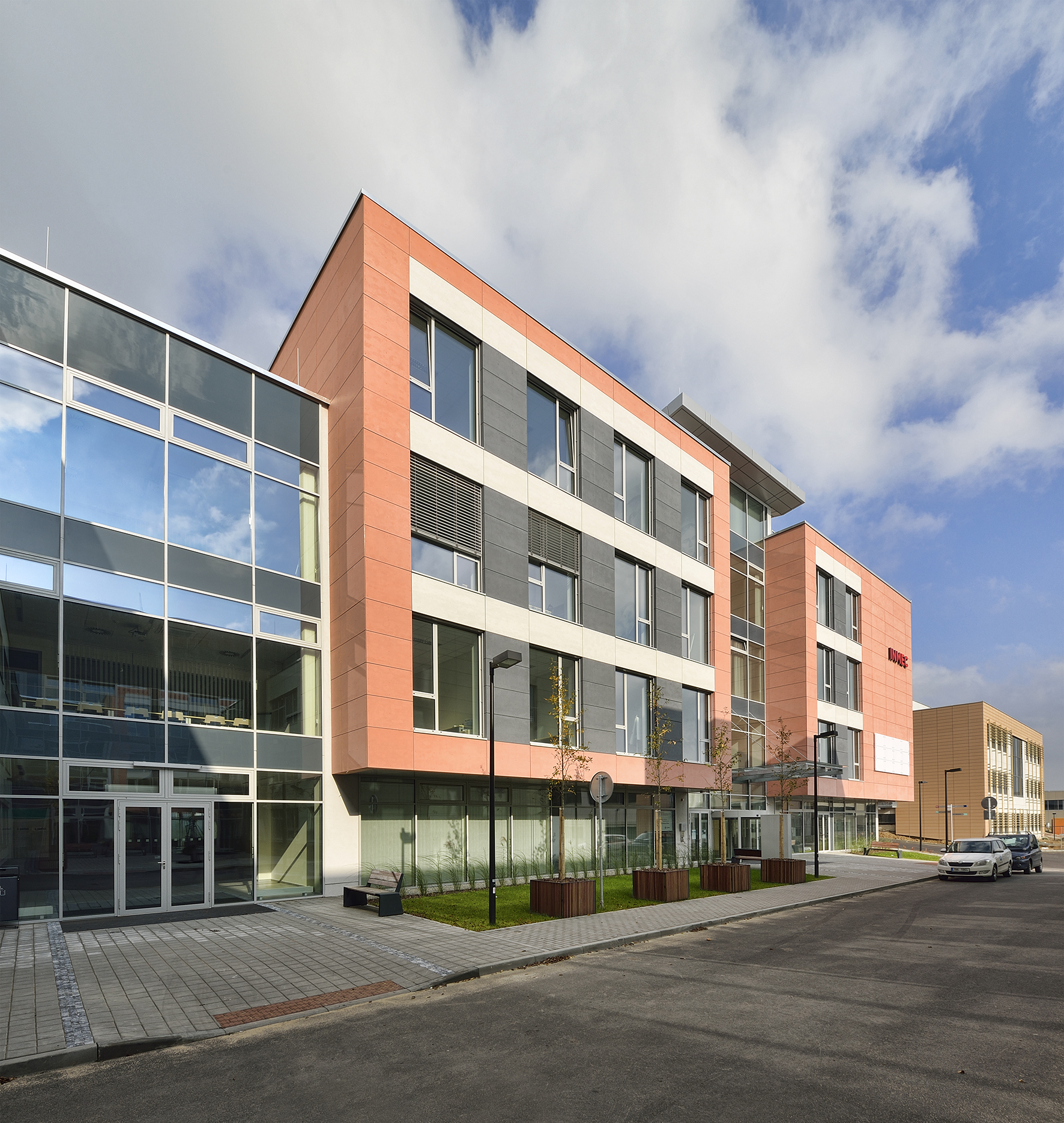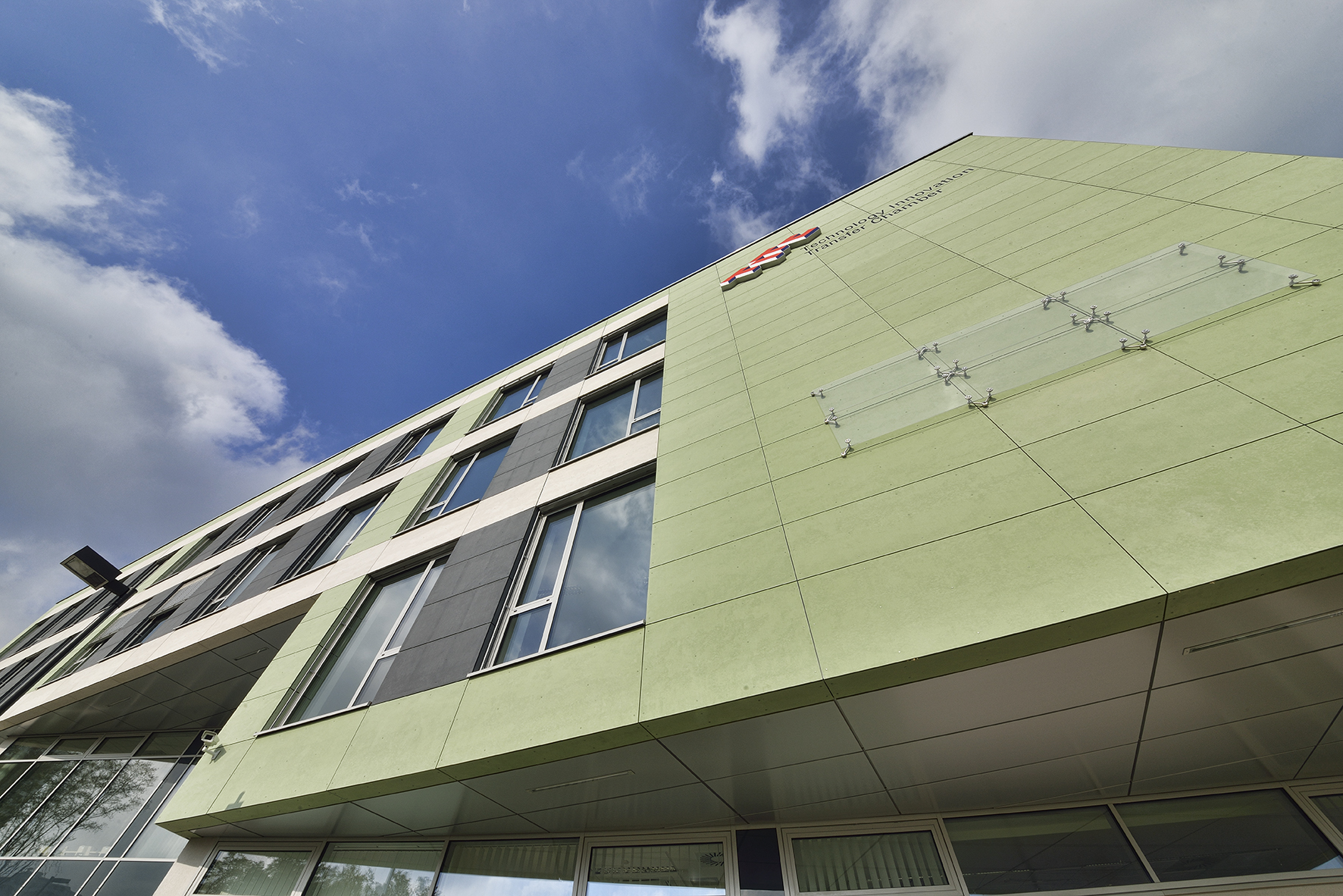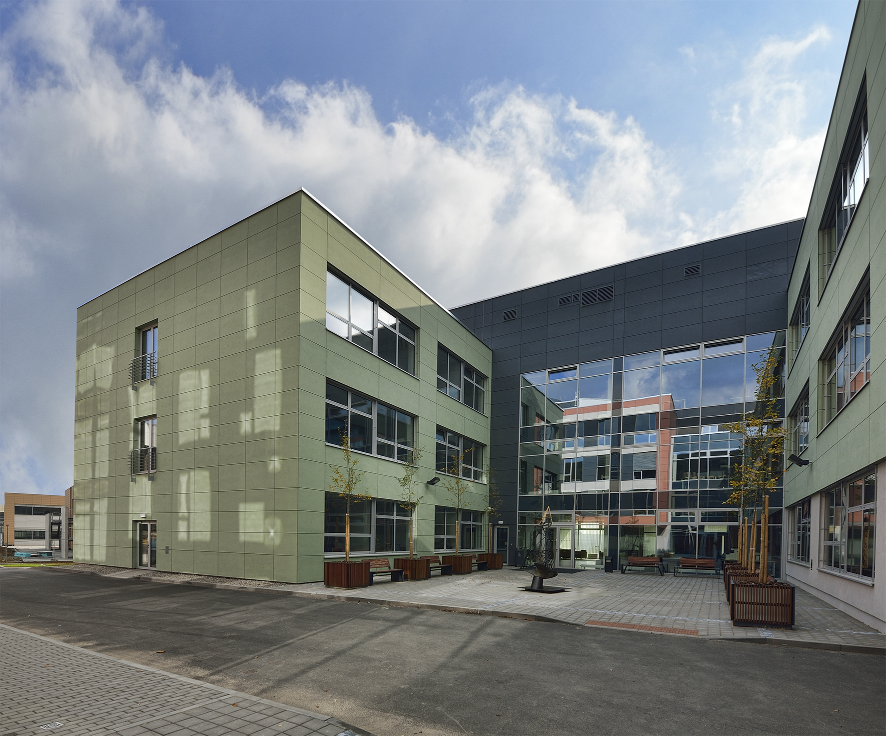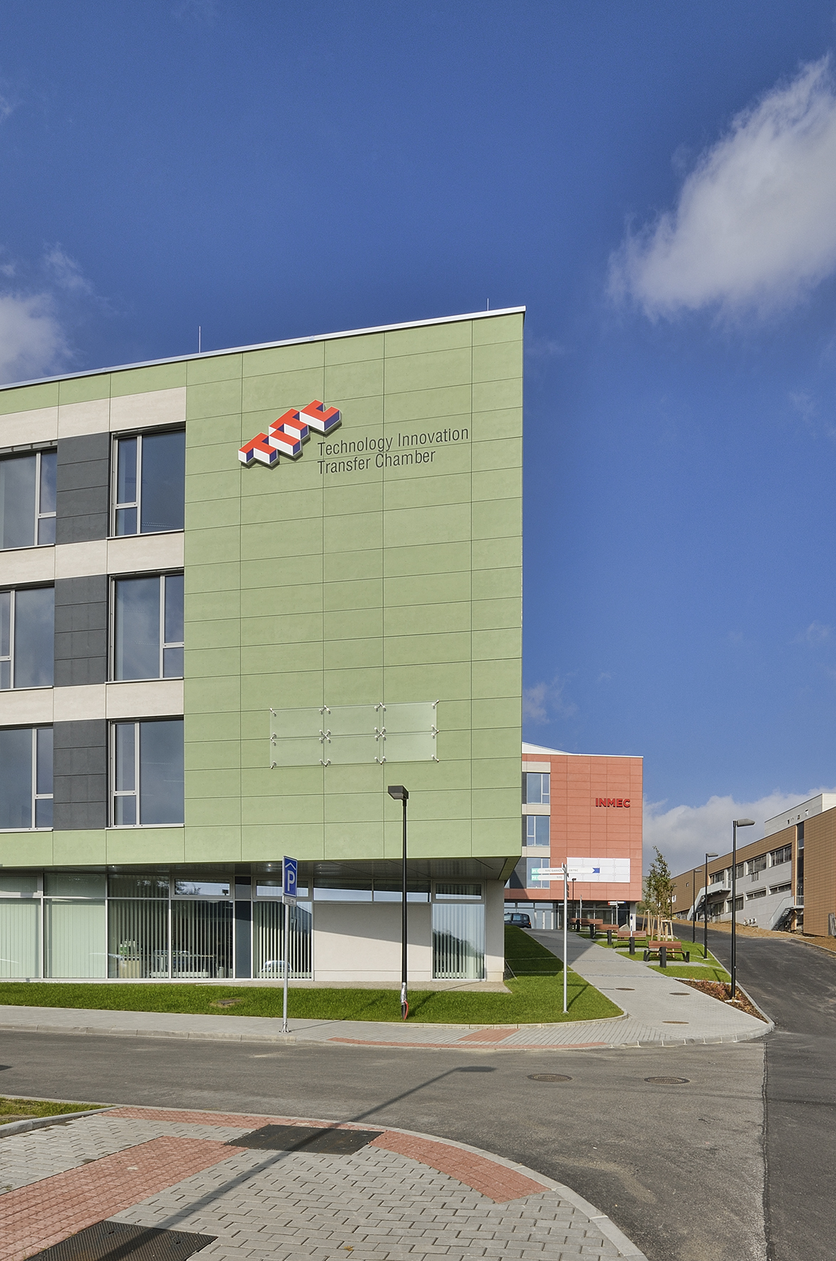 Fasáda inovačného centra je riešená ako odvetraná s okennými otvormi vybavenými elektrickými žalúziami. Ako obklad boli použité veľkoformátové vláknocementové fasádne dosky EQUITONE TECTIVA.